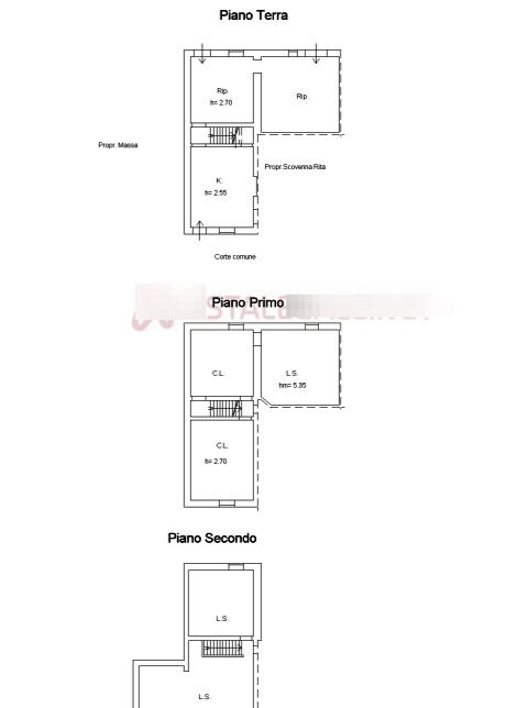 L'abitazione è distribuita su tre piani, collegati da scala interna, ed è composto da soggiorno, cucina, bagno e ripostigli al piano terra; da camere e ripostigli al primo piano; da due ripostigli in soffitta al secondo piano.
