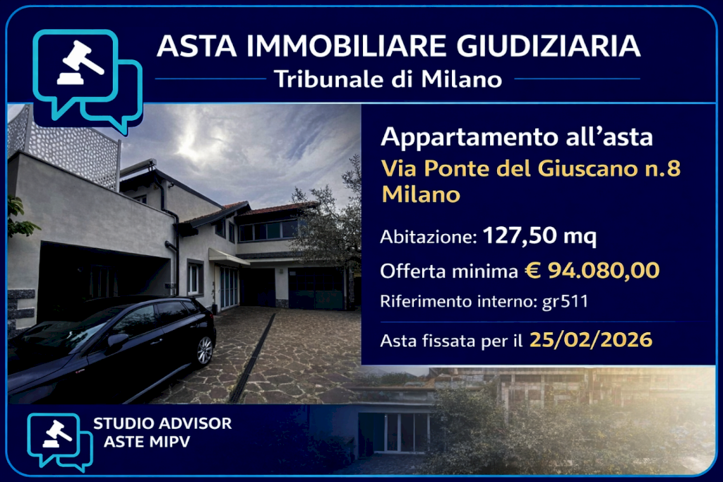 Questo annuncio è stato redatto da Studio Advisor Aste MiPv sulla base della documentazione ufficiale di vendita. Le informazioni qui riportate non sostituiscono la pubblicità legale e potrebbero contenere imprecisioni o variazioni rispetto agli atti ufficiali. Studio Advisor Aste MiPv declina ogni responsabilità per errori, omissioni o modifiche intervenute successivamente alla pubblicazione.