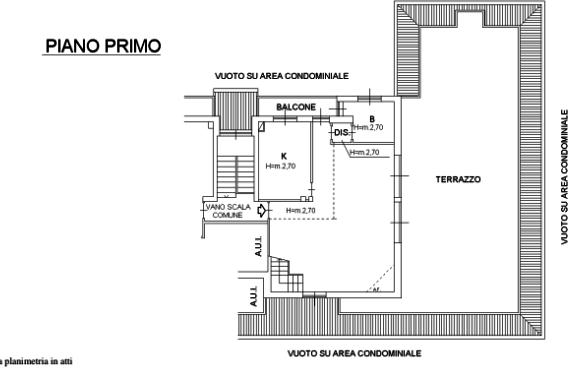 Al piano primo si compone di soggiorno/pranzo, cucina, disimpegno, servizio igienico e balcone.