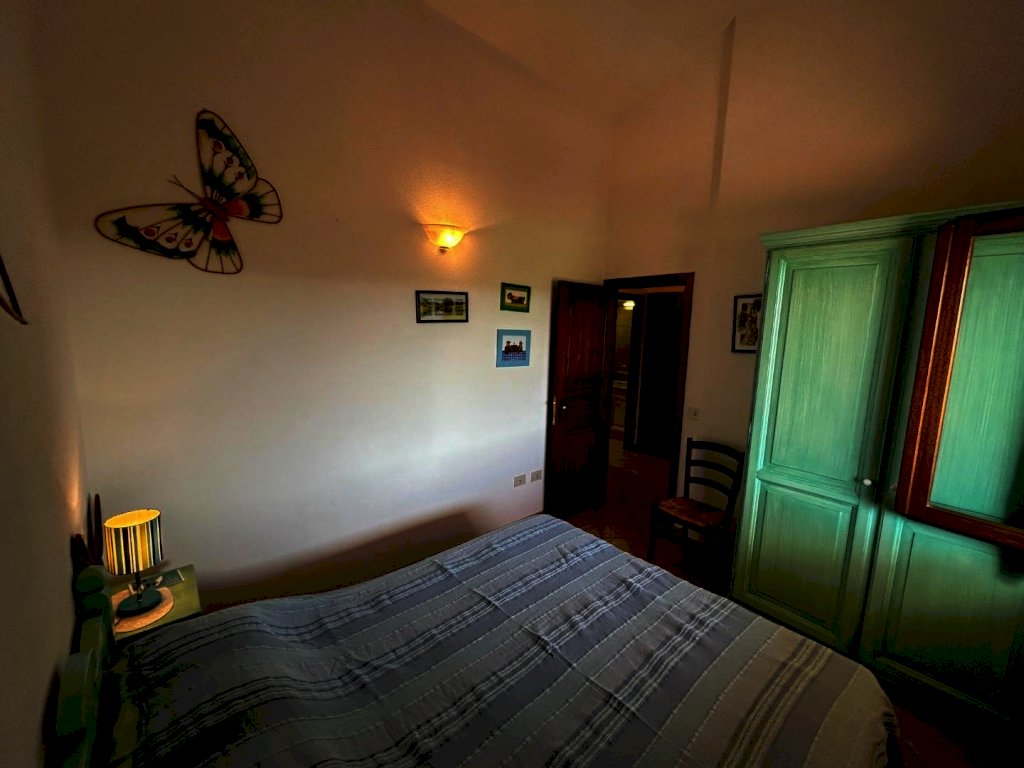 Si accede all' immobile dalla via pubblica mediante un camminamento che conduce al giardino al Piano terra che collega il piano primo in cui si sviluppa l' appartamento, mediante una scala. Lo stesso risulta composto da corridoio d' ingresso, cucinino separato e ampio soggiorno- pranzo molto luminoso, con camino, collegato da un ampia porta finestra ad una comoda veranda da cui si ha la vista mare. La zona giorno è collegata alla zona notte da un ampio disimpegno, con alcuni armadi e ripostigli, dal quale si accede all' ampio bagno finestrato ed alle due camere da letto matrimoniali.