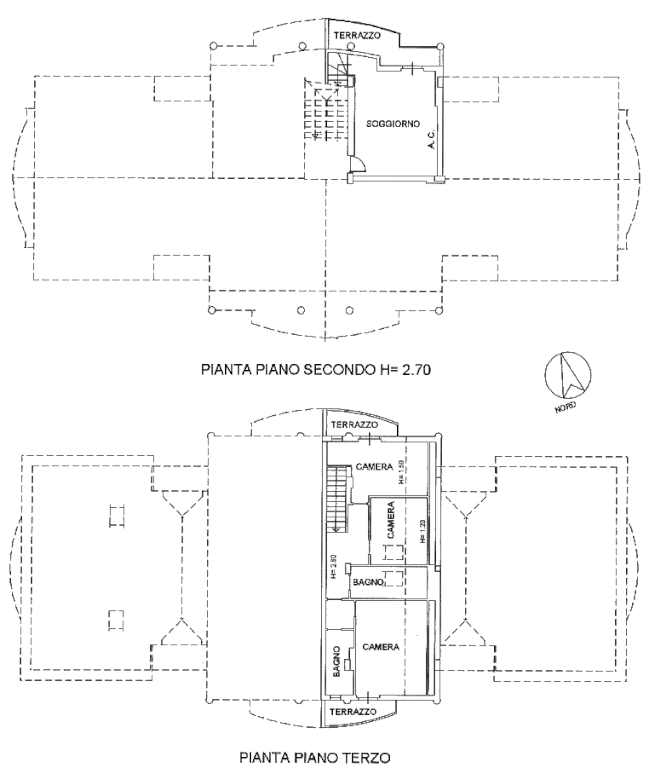 Piano terzo: due disimpegni, tre camere da letto, due bagni (di cui uno con finestra ed uno con lucernaio) e due terrazzi, il tutto in buono strato di conservazione. Completa la proprietà un garage di 32 mq e un fondo di 17 mq.
