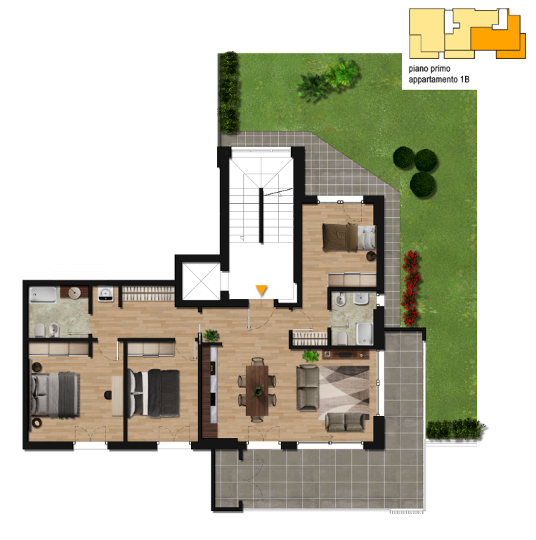 RESIDENZA DEL SOLE. In piccola palazzina di sole 6 unità proponiamo in vendita in esclusiva appartamenti con due o tre camere con giardino o grande terrazzo. Tutti gli appartamenti hanno garage e posto auto esclusivo. Dotata di ascensore. Nello Specifico questo appartamento ha soggiorno con cucina, tre camere, due bagni, un grande terrazzo e un giardino di 350 mq. Inoltre garage doppio posto auto. Capitolato di altissima qualità: