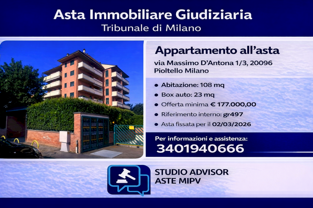 Questo annuncio è stato redatto da Studio Advisor Aste MiPv sulla base della documentazione ufficiale di vendita. Le informazioni qui riportate non sostituiscono la pubblicità legale e potrebbero contenere imprecisioni o variazioni rispetto agli atti ufficiali. Studio Advisor Aste MiPv declina ogni responsabilità per errori, omissioni o modifiche intervenute successivamente alla pubblicazione.