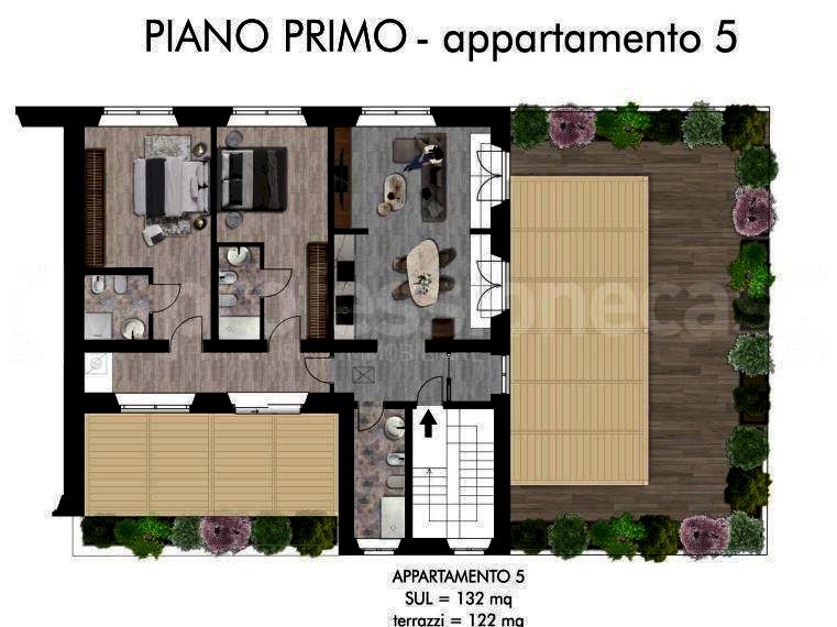 - L'appartamento n.5 €690.000 è un trilocale di 132 mq circa , 2 terrazze per totali 122mq circa, cantina e posto auto.