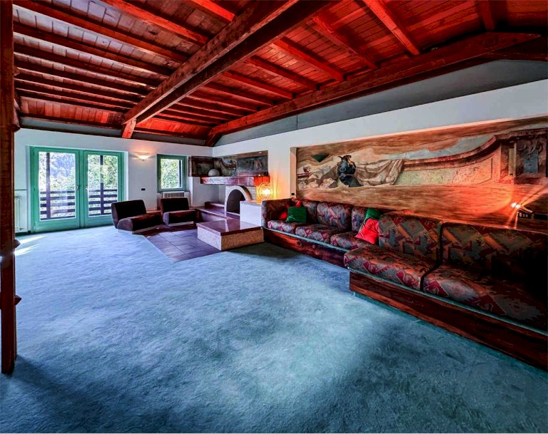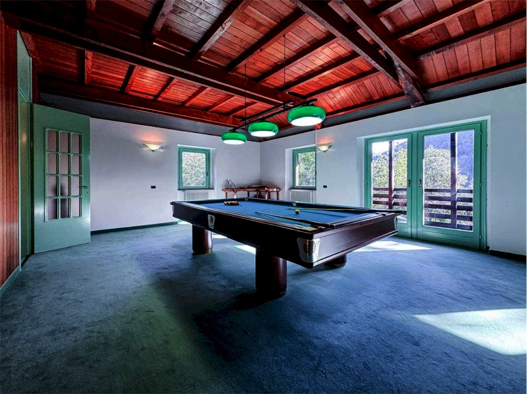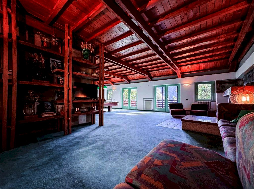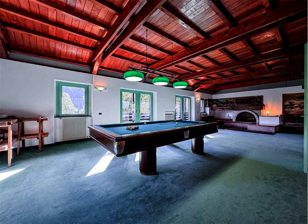 - Piano superiore: ampio open space con travi a vista, grande caminetto, area cinema e tavolo da biliardo, ulteriore camera matrimoniale e balcone panoramico con splendida vista sulle montagne.
