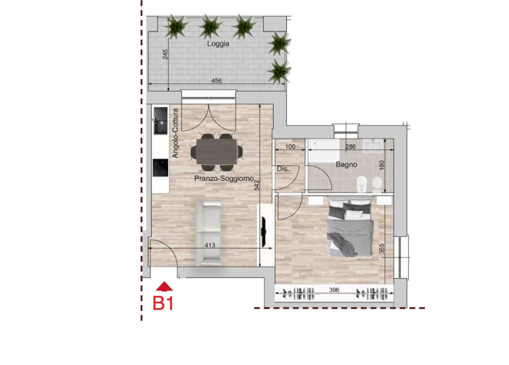 Grazioso mini appartamento, con soggiorno con angolo cottura, disimpegno, camera matrimoniale, bagno e ampia loggia.