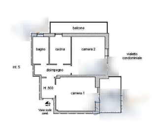 L'unità immobiliare si compone di: cucina, bagno, due camere e due balconi.