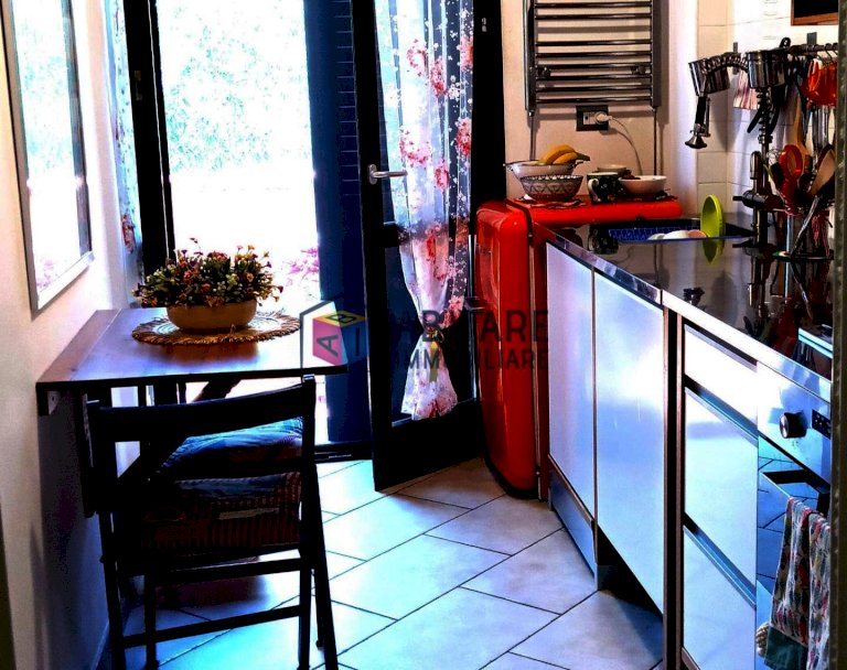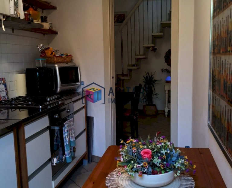 La cucina, situata in un vano proprio, è perfetta per chi ama cucinare e desidera uno spazio dedicato. Il soggiorno, arredato con un divano letto e una scala a vista, crea un'atmosfera calda e invitante. Dal soggiorno si accede a un ampio terrazzo, ideale per rilassarsi all'aria aperta.