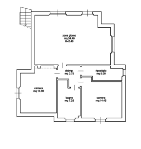 L'immobile è costituito da zona giorno, un disimpegno, un bagno, due camere e un ripostiglio ed è libero su tutti i lati.