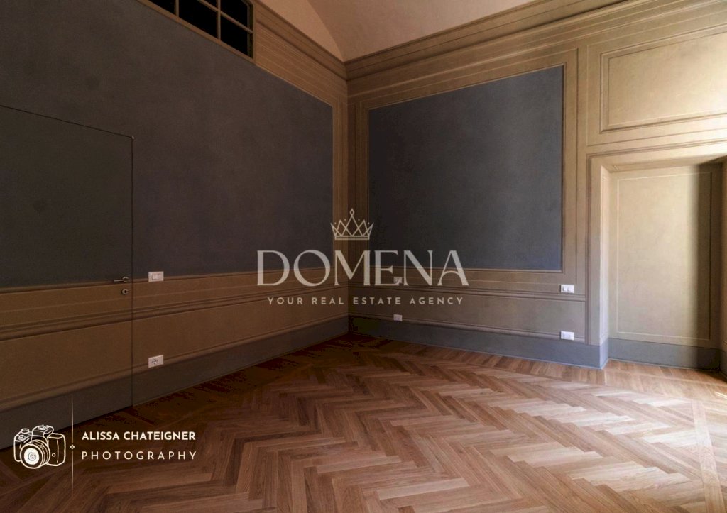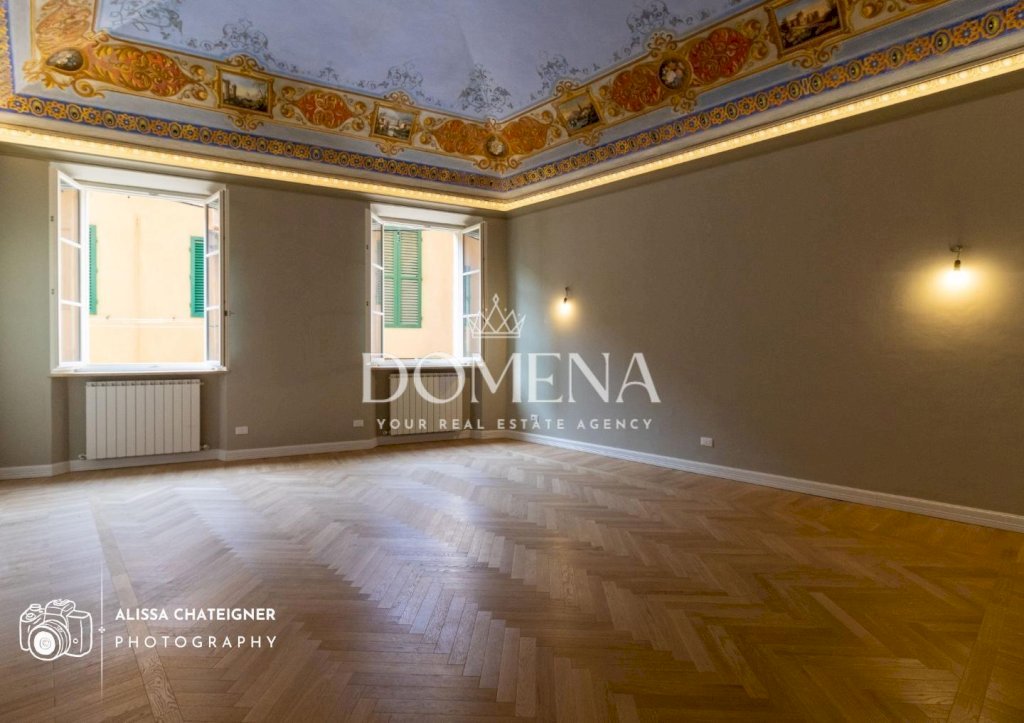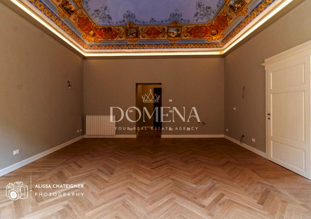 Varcando la soglia, un elegante ingresso con ripostiglio e locale tecnico introduce al luminoso soggiorno, dove due grandi finestre inondano di luce l’ambiente, esaltando gli affreschi originali sul soffitto, valorizzati da un raffinato sistema LED a cornice.