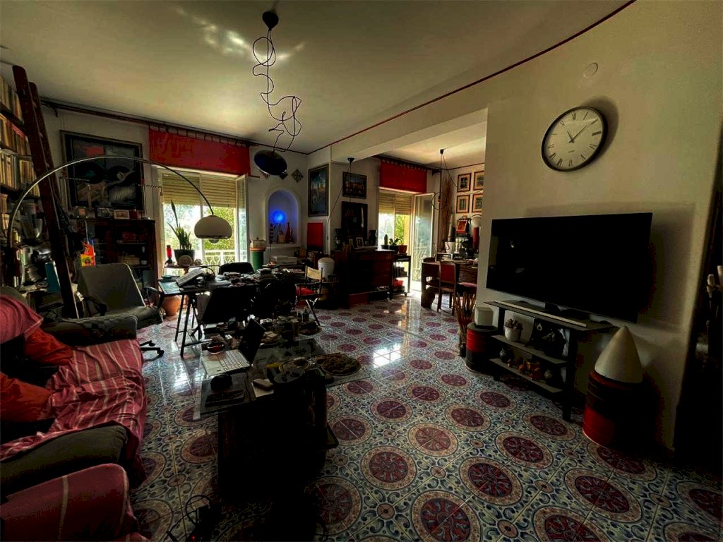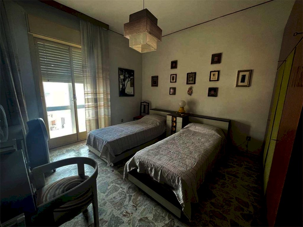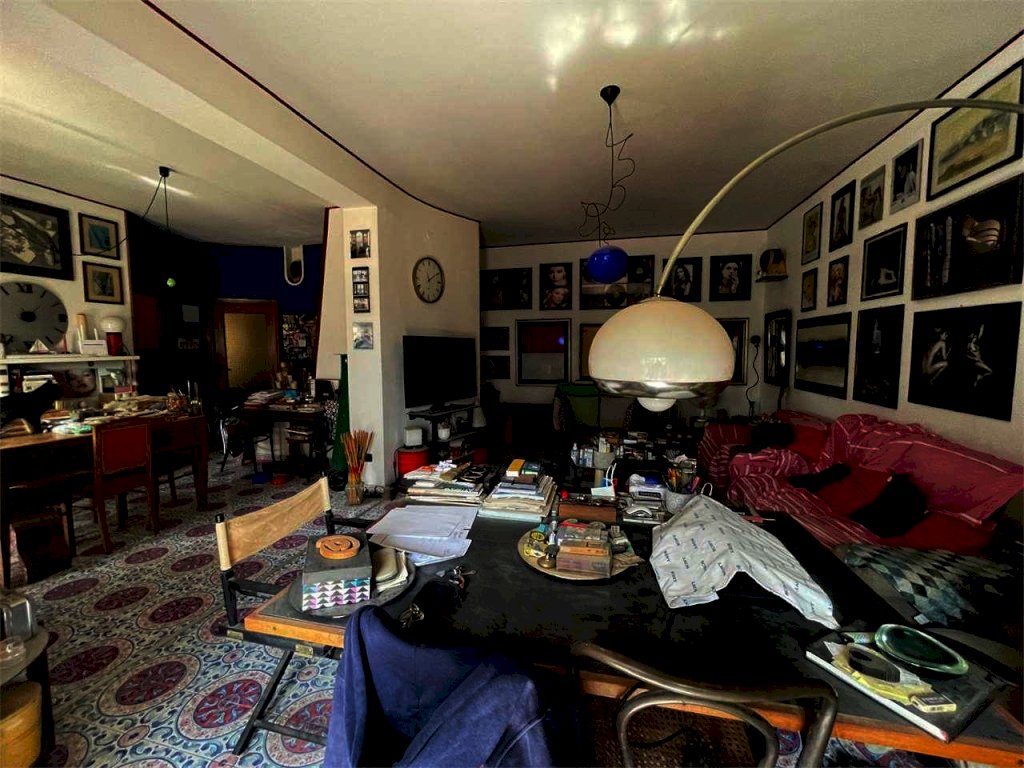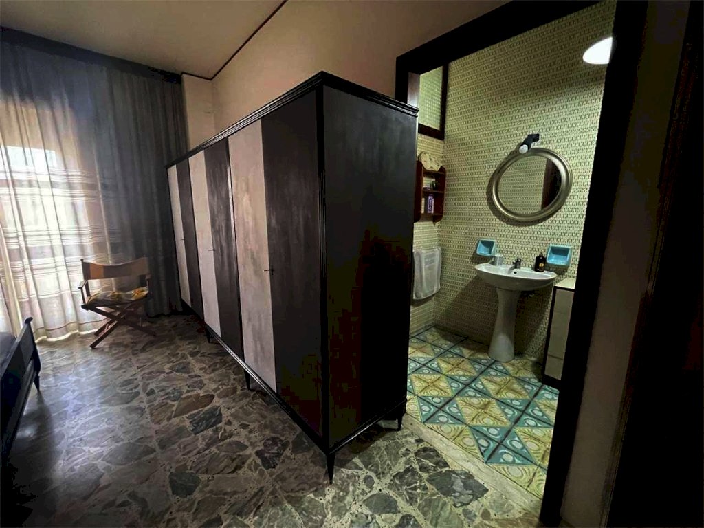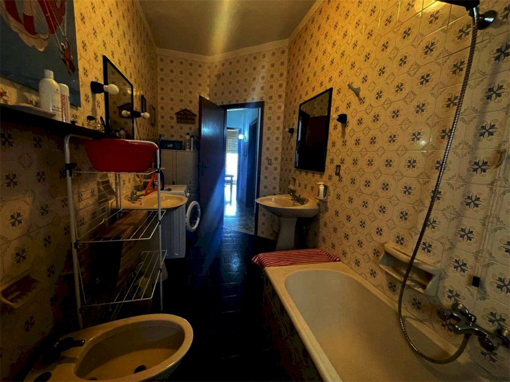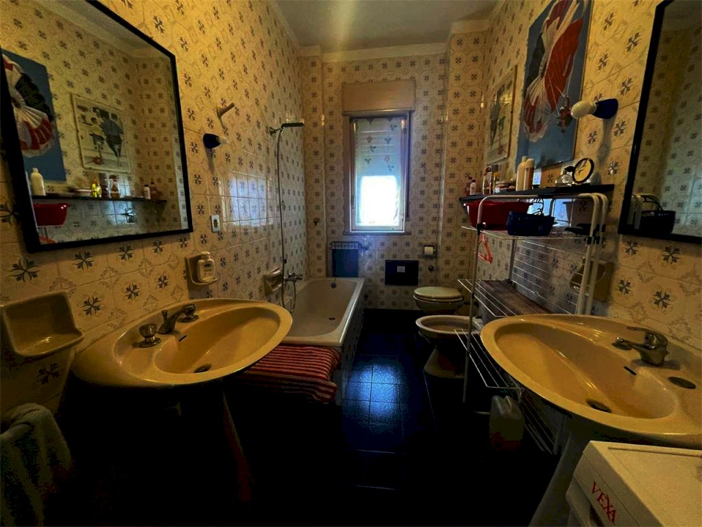 L'unità immobiliare "grande" ha ingresso, salone doppio con accesso al balcone principale, camera da letto matrimoniale con balcone esclusivo e bagno in camera (diviso in antibagno con lavabo e bagno con doccia e finestra), disimpegno, bagno principale (con due lavabi, vasca, angolo lavanderia e finestra), cucina abitabile con finestra, camera da letto con accesso al balcone principale, ripostiglio. La seconda unità ("piccola") ha ingresso, salone doppio con accesso al balcone principale, camera singola con accesso al balcone principale, bagno principale con doccia e finestra, cucina abitabile con accesso al balcone esclusivo, doppio servizio con finestra. L'abitazione complessiva (da ristrutturare, se non per i bagni dell'unità piccola) ha complessivamente sette vani con due saloni doppi, tre camere e tre bagni (oltre due cucine). L'unità grande comprende quattro vani (con il salone doppio e due camere) e l'unità piccola ha tre vani (con il salone doppio e la camera). Il posto auto è doppio.