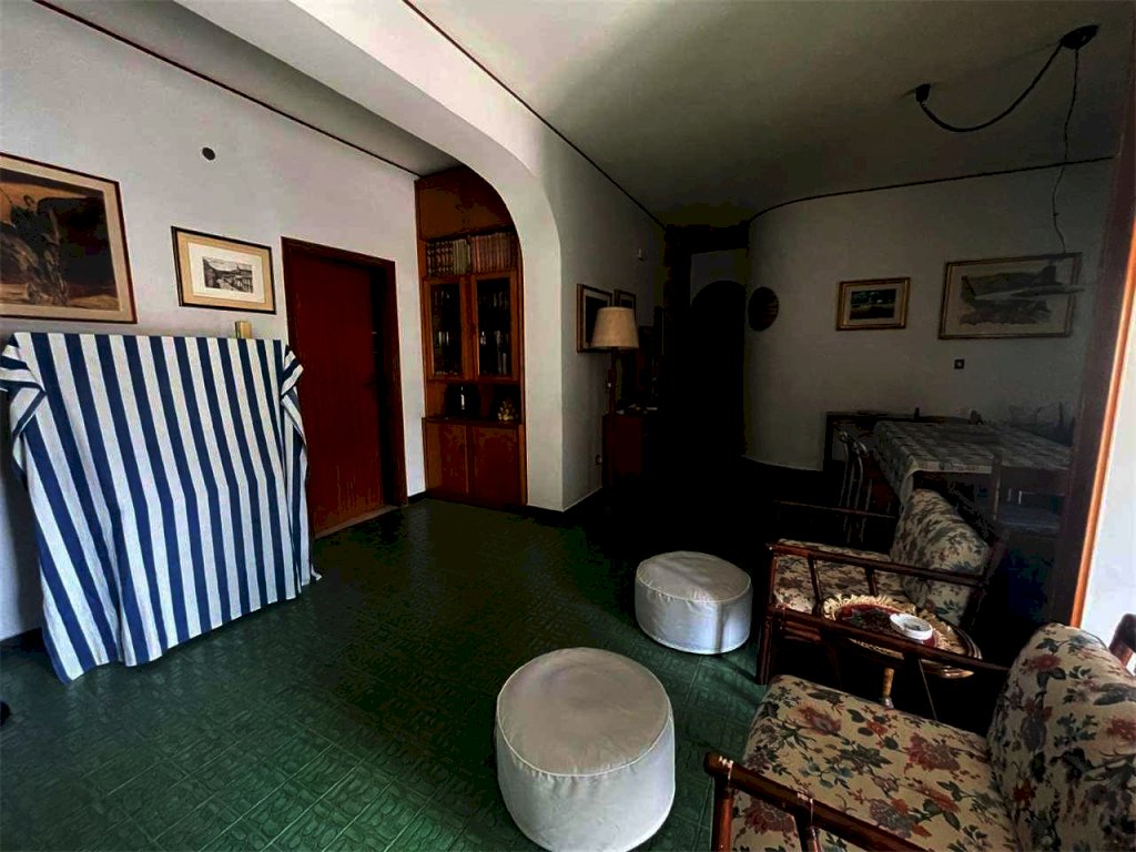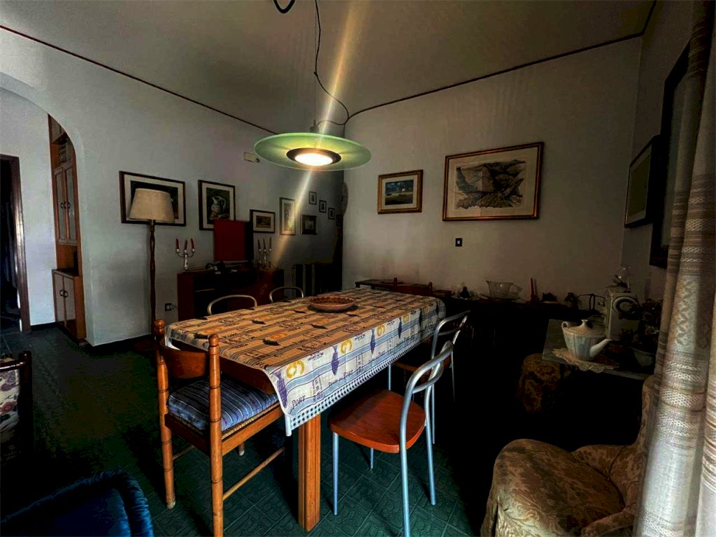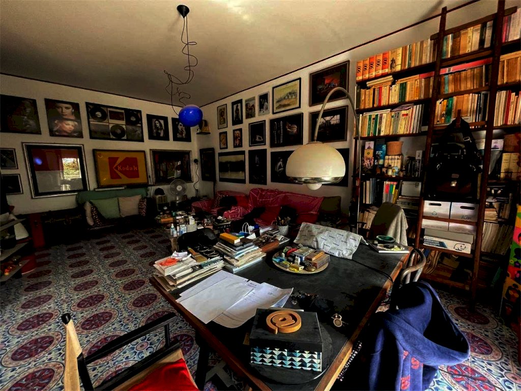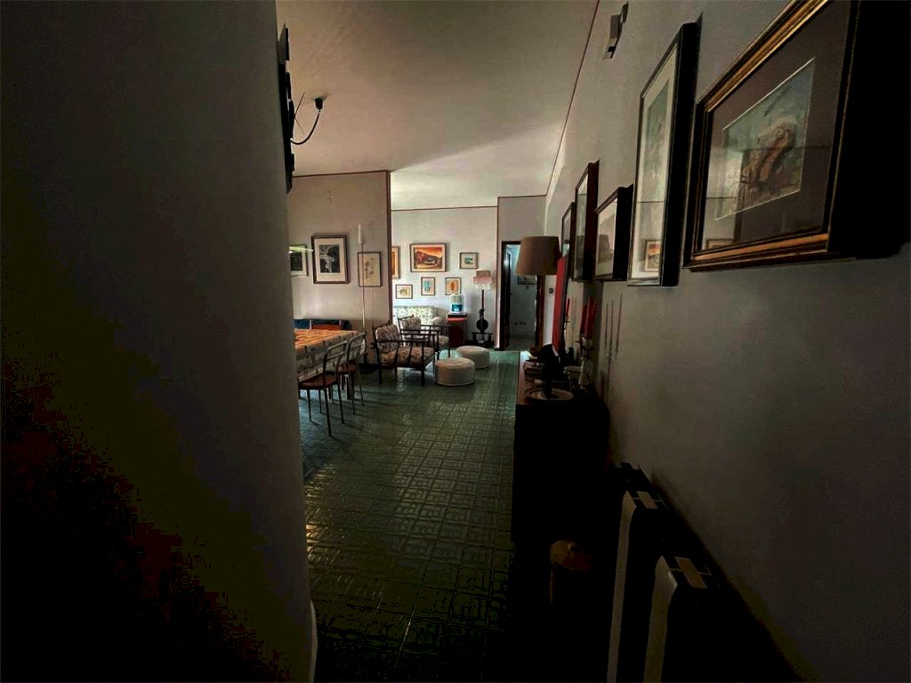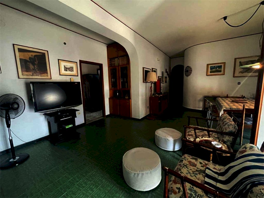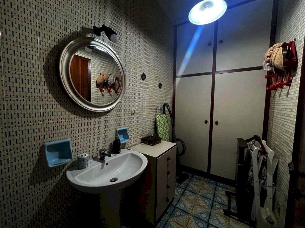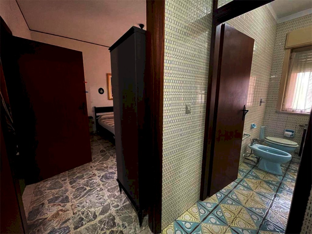L'unità immobiliare "grande" ha ingresso, salone doppio con accesso al balcone principale, camera da letto matrimoniale con balcone esclusivo e bagno in camera (diviso in antibagno con lavabo e bagno con doccia e finestra), disimpegno, bagno principale (con due lavabi, vasca, angolo lavanderia e finestra), cucina abitabile con finestra, camera da letto con accesso al balcone principale, ripostiglio. La seconda unità ("piccola") ha ingresso, salone doppio con accesso al balcone principale, camera singola con accesso al balcone principale, bagno principale con doccia e finestra, cucina abitabile con accesso al balcone esclusivo, doppio servizio con finestra. L'abitazione complessiva (da ristrutturare, se non per i bagni dell'unità piccola) ha complessivamente sette vani con due saloni doppi, tre camere e tre bagni (oltre due cucine). L'unità grande comprende quattro vani (con il salone doppio e due camere) e l'unità piccola ha tre vani (con il salone doppio e la camera). Il posto auto è doppio.