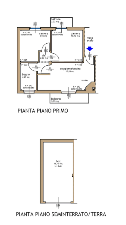Trattasi di appartemento al piano primo composto da soggiorno/cucina/cottura, bagno, disimpegno, due camere e due balconi.