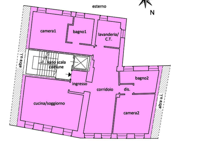 L'unità si trova al primo piano di un edificio residenziale e risulta composta ingresso, cucina-soggiorno, ampio corridoio centrale (utilizzato come salotto), lavanderia con centrale termica, due camere, disimpegno e due bagni.
