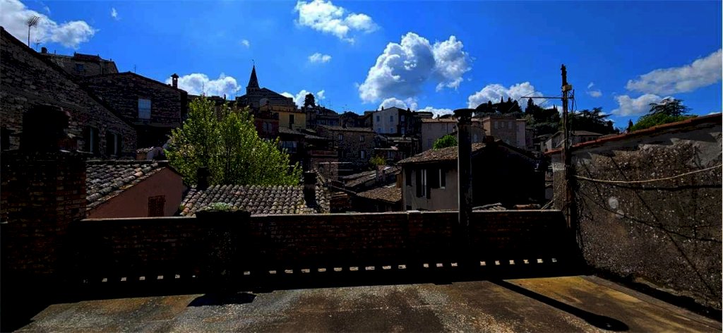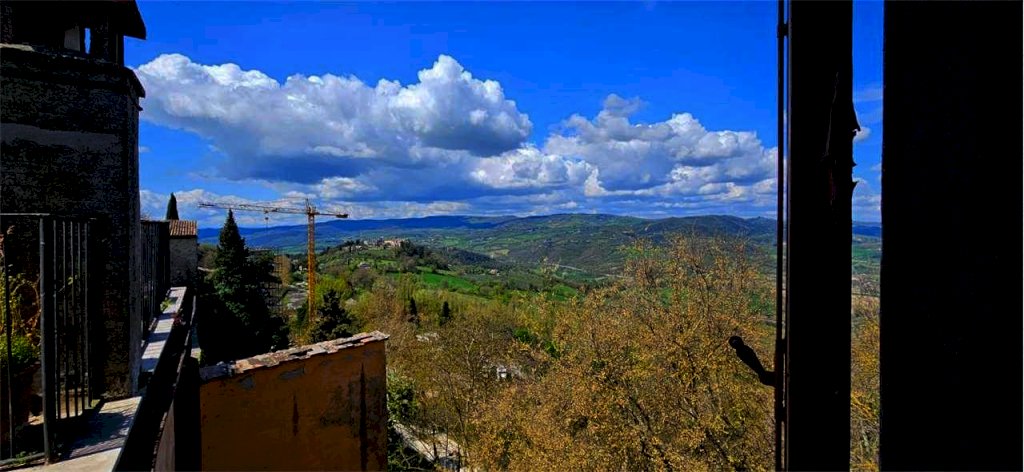 In una delle zone più panoramiche e comode del centro storico di Todi, proponiamo in vendita appartamento, al piano secondo di una palazzina composta da solo tre unità abitative, della superficie commerciale complessiva di circa 110 mq. L'appartamento, in parte da ristrutturare ed in parte ristrutturato, composto da: ingresso, salotto, sala da pranzo con camino, cucinotto, tre camere da letto che godono di una suggestiva vista sulla vallata e sullo storico Convento di Montesanto, ed un bagno. Utilizzando un accesso esterno all'appartamento si raggiunge una splendida terrazza condominiale, della superficie di circa 50 mq con meravigliosa vista sui caratteristici tetti della città e sullo skyline tuderte. Opportunità di acquistare anche ampio fondo della superficie di circa 75 mq attualmente adibito a cantina, con la possibilità di trasformarlo in rustico o taverna.