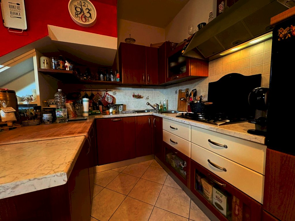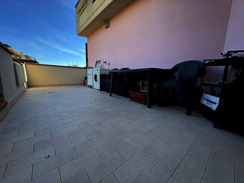 zona giorno con angolo cottura e accesso su terrazza; disimpegno-corridoio, una camera matrimoniale con balcone, cameretta con affaccio su grande terrazza di circa 30 mq, ripostiglio e servizio igienico finestrato.