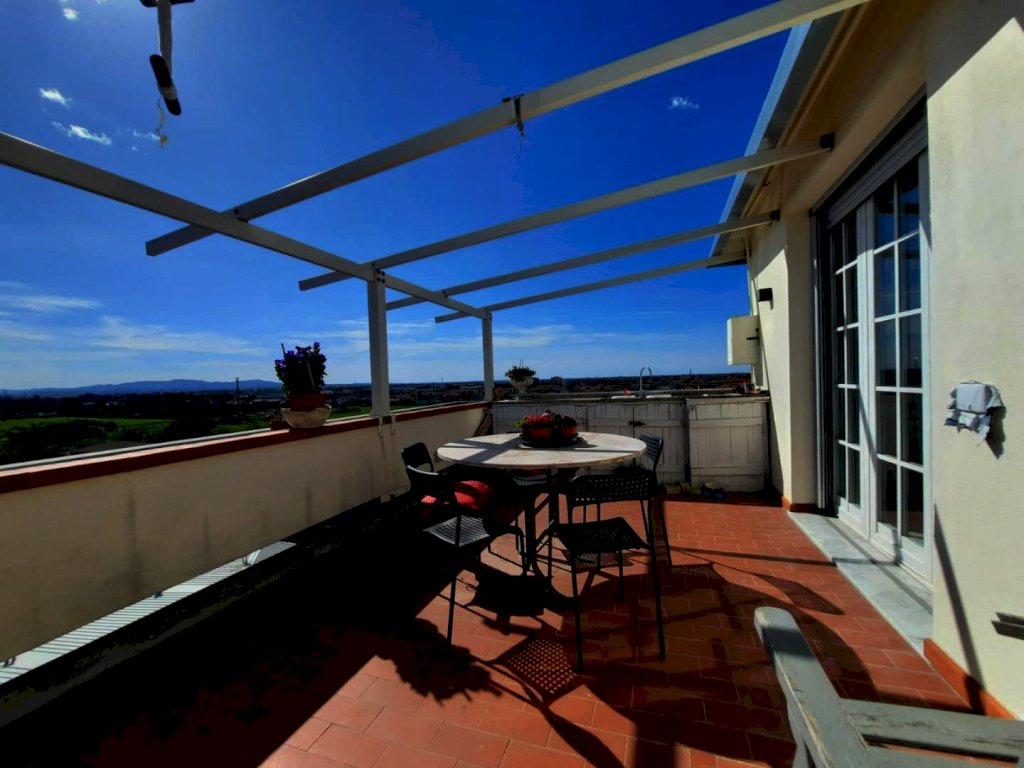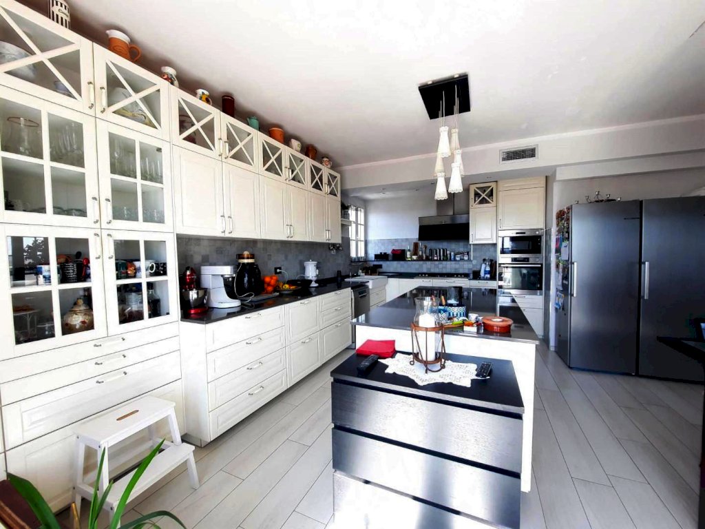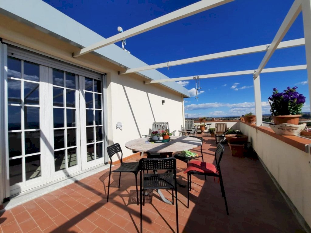 Rif. V350 CASCINA - IN ESCLUSIVA - APPARTAMENTO ATTICO 4 VANI con TERRAZZA PANORAMICA posto al 7° ed ULTIMO PIANO con ascensore, è il solo appartamento presente sul piano, libero su quattro lati e circondato da una splendita terrazza abitabile di circa 103 mq che circonda l'appartamento su tre lati e accessibile da ogni stanza. L’abitazione, dal taglio moderno e dalle metrature generose, si compone di: ingresso su piccolo disimpegno, ampia zona giorno open space (con possibilità di separare soggiorno e cucina), nella zona soggiorno è collocata una stufa a pellet e accesso diretto alla terrazza tramite ampia porta finestra, la spaziosa cucina-pranzo si articola su due lati e corredata di una comosissima isola attrezzata anche da questa zona è possibile l'accesso sulla terrazza, disimpegno notte arredabile,