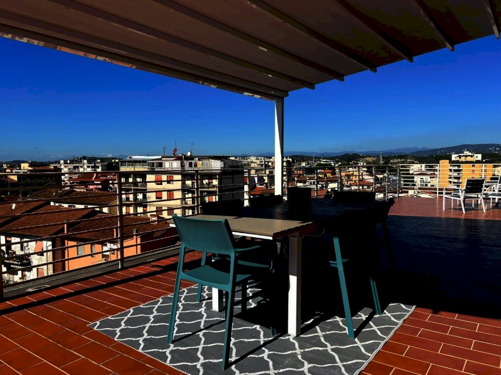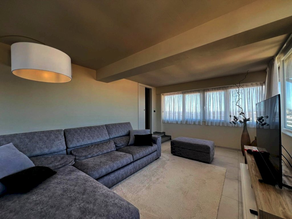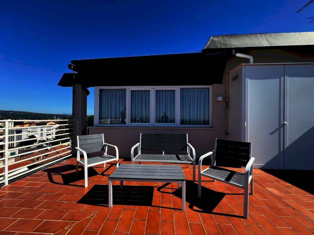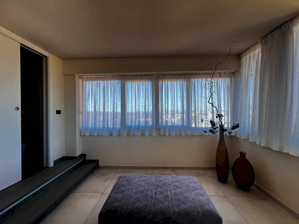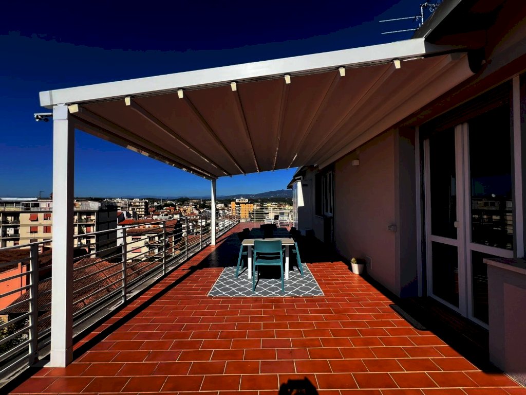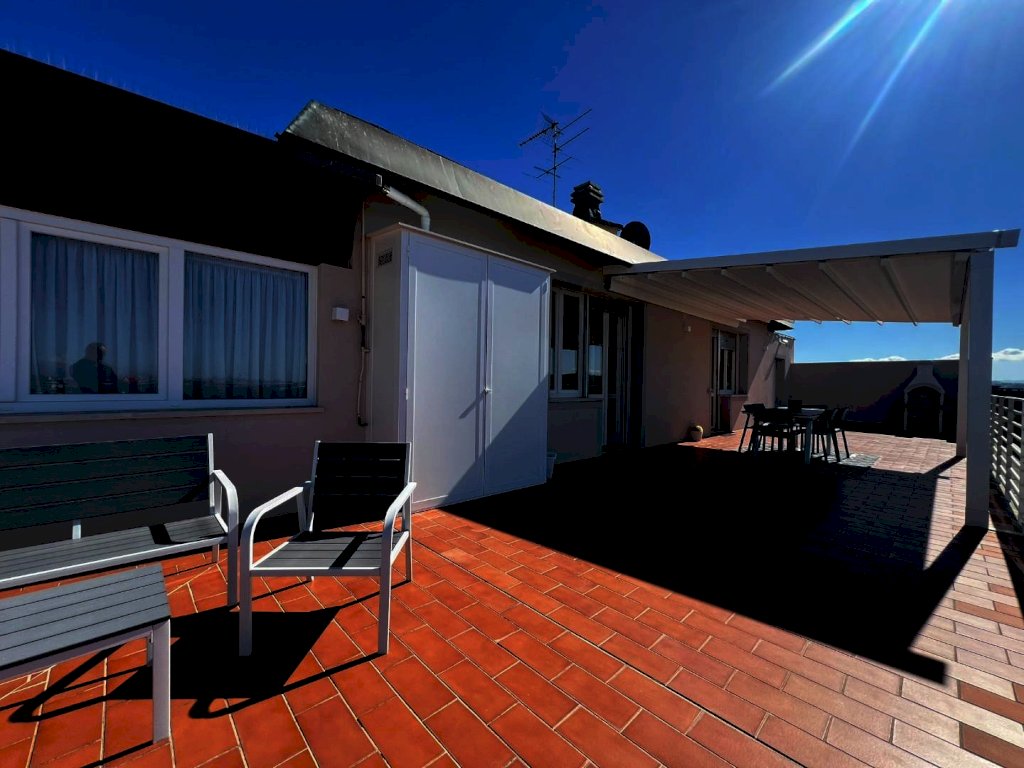 La sua composizione: ingresso/disimpegno, vano cottura e pranzo, oltre locale soggiorno informale completamente separato e contornato di pareti vetrate panoramiche, bagno e due camere da letto ampie. L'appartamento è anch'esso completamente ristrutturato e dotato di tutti i comfort, grazie agli impianti nuovi, alla presenza dell'aria condizionata, e agli ottimi infissi ad abbattimento acustico e termico, che conferiscono alla casa non solo un ottimo isolamento ma anche un'estetica moderna e sobria, che si sposa bene con un ambiente giovanile fresco, sapientemente arredato ultimato ed organizzato, infatti i materiali, i pavimenti, i rivestimenti risultano tutti di ottima qualità. Vera perla aggiunta e inimitabile la terrazza abitabile con tre diversi accessi; 80 mq di spazio esterno vivibile soleggiato e ben organizzato per pranzi, cene e momenti di relax unico, parzialmente coperta da pensilina con copertura elettronica retrattile e completa di illuminazione. Classe energetica A1; IPE 111,62. Euro 334.000,00