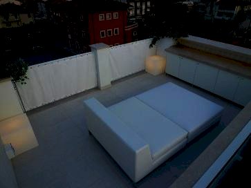 FORTE DEI MARMI - Nella piazza centrale di Forte dei Marmi, piazza Garibaldi, nel centro della vita, dello shopping, e della ristorazione. Un appartamento di cento metri quadrati con terrazza panoramica privata al livello superiore, camera con bagno privato, un bagno, salone open space divisibile e trasformabile in seconda camera da letto, cucina super attrezzata con lavastoviglie, lavatrice, frigo, microonde, piano cottura, frigo/cantina vini, al piano inferiore video proiettore, impianto home cinema, TV plasma, TV led. Terrazza attrezzata con frigobar, doccia, letto trasformabile.