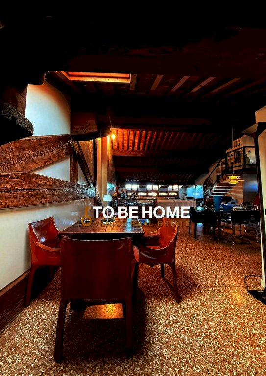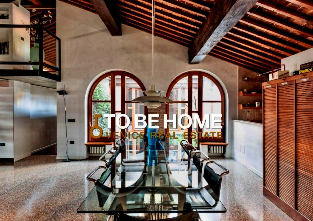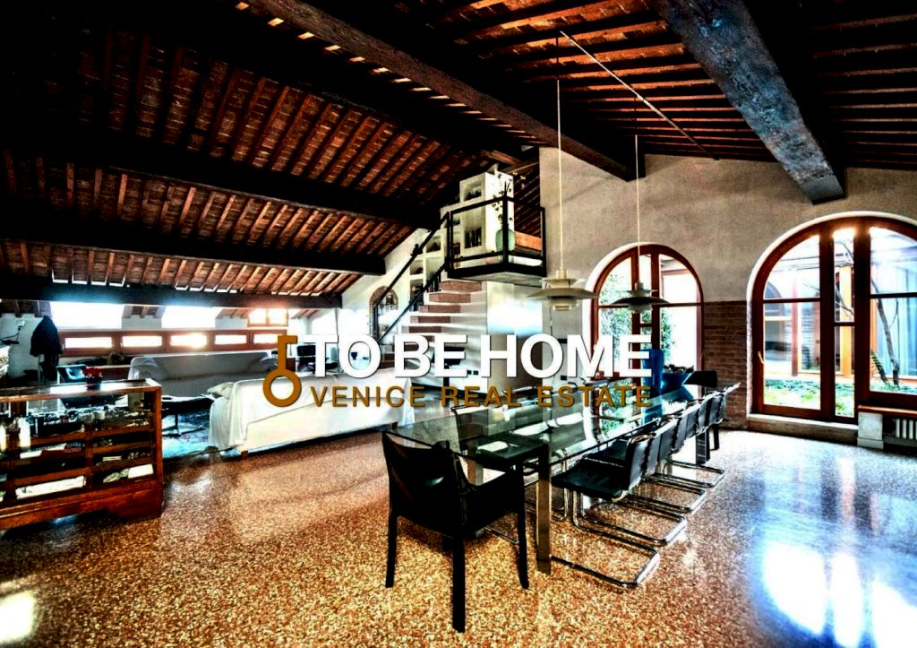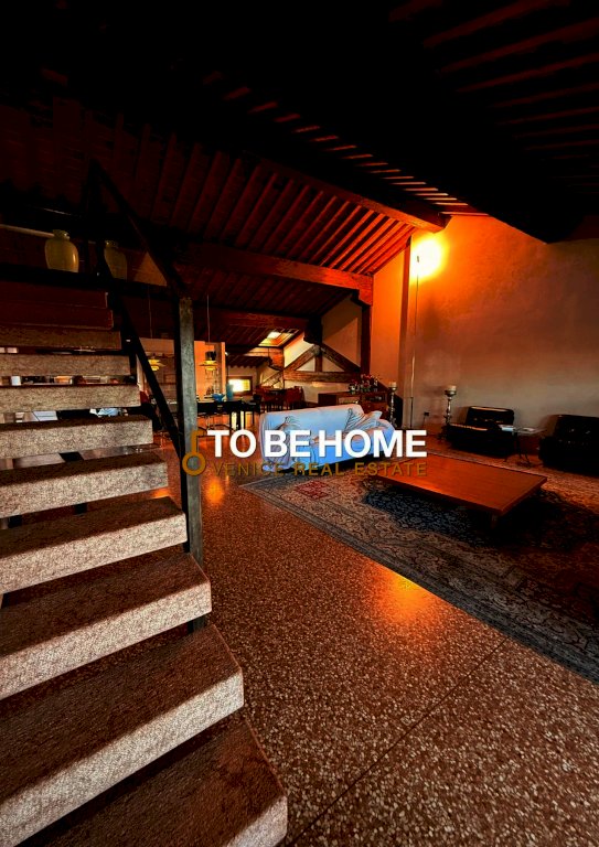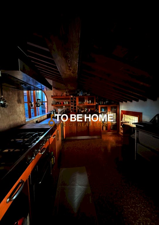 Il piano principale accoglie un ampio living con pavimento alla veneziana, travi originali a vista e una grande cucina a isola, perfettamente integrata negli spazi aperti.