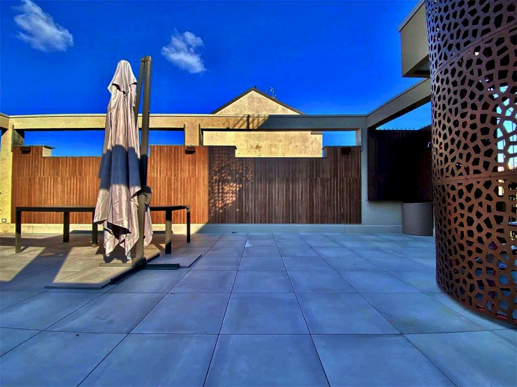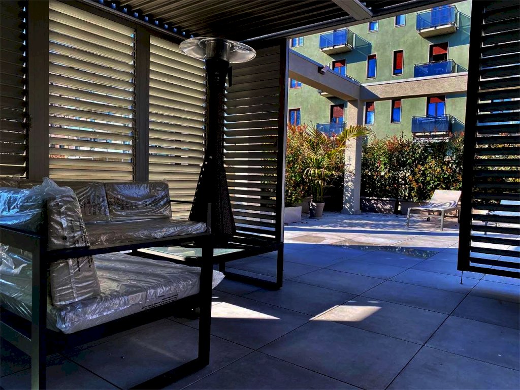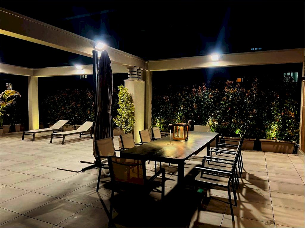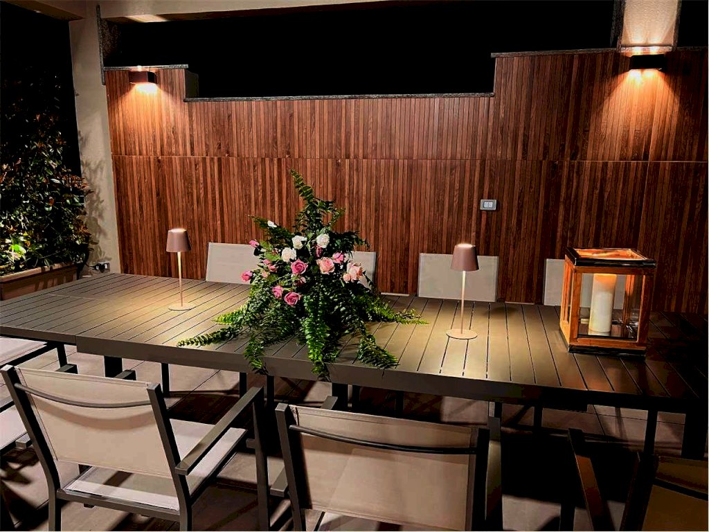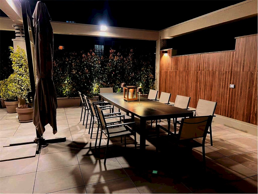 L'immobile gode di un ampio terrazzo attrezzato composto da: zona gazebo (completamente in alluminio color tortora con illuminazione a strisce led, zona tv esterna con arredo zona living), zona cucina esterna (predisposizione impiantistica), zona doccia con colonna in acciaio spazzolato, zona pranzo corredata per ospitare dodici persone e zona relax con le sedie sdraio in alluminio color tortora.