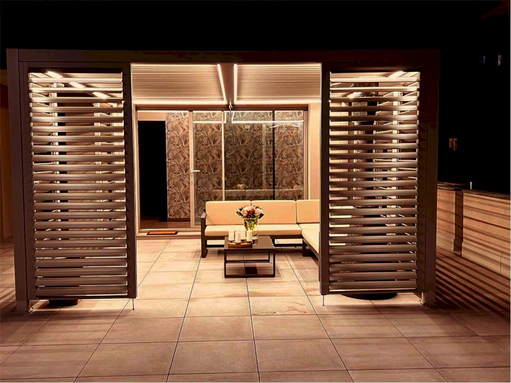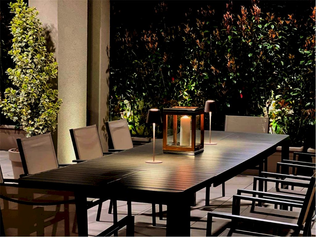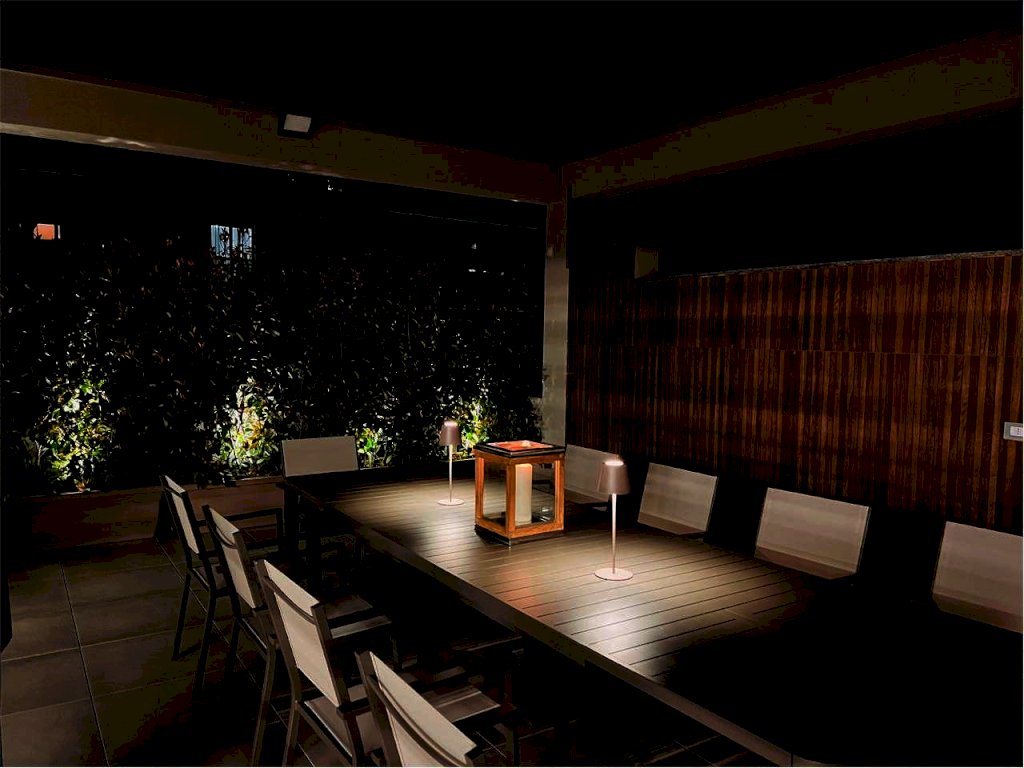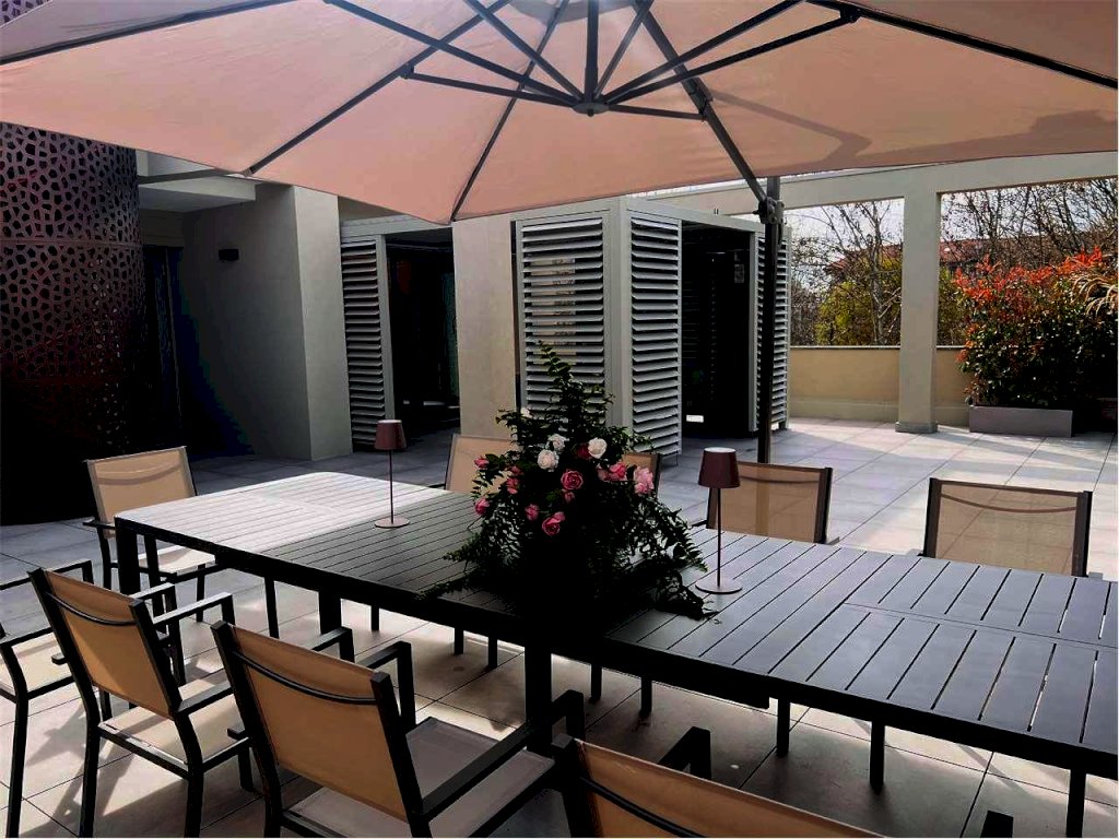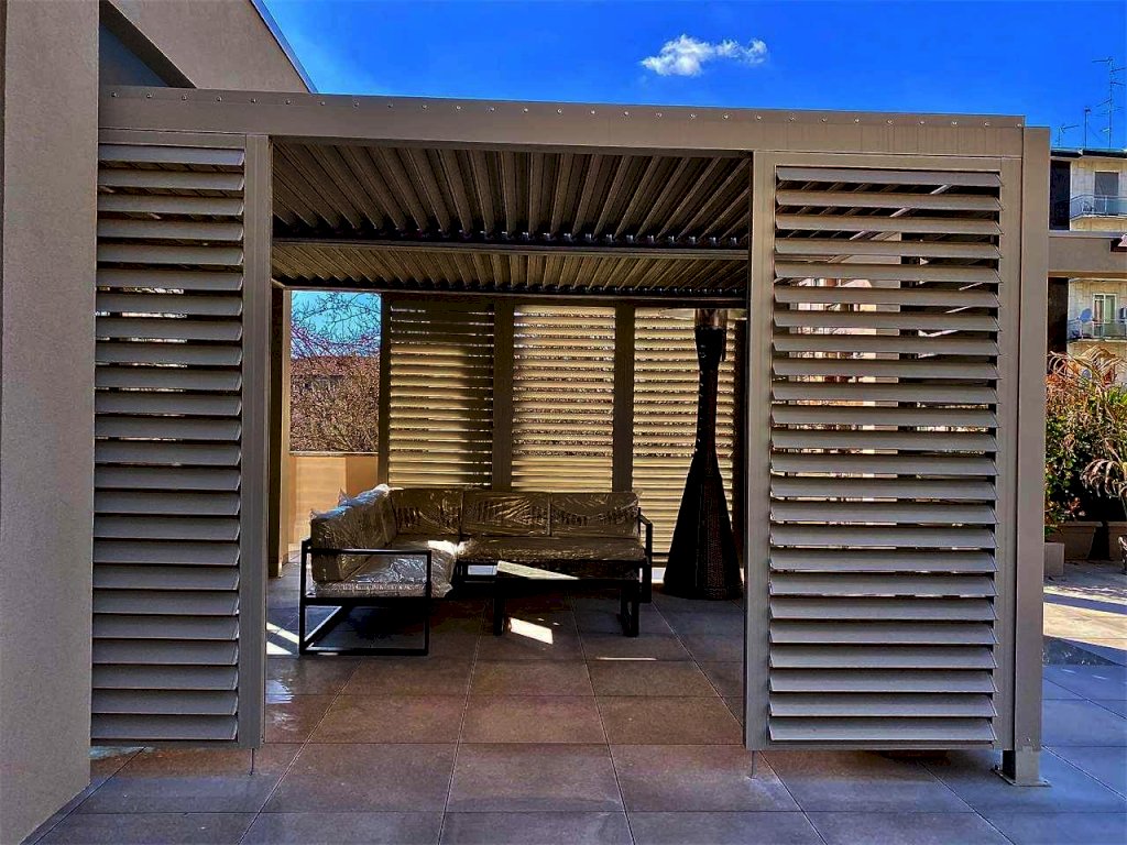 L'immobile gode di un ampio terrazzo attrezzato composto da: zona gazebo (completamente in alluminio color tortora con illuminazione a strisce led, zona tv esterna con arredo zona living), zona cucina esterna (predisposizione impiantistica), zona doccia con colonna in acciaio spazzolato, zona pranzo corredata per ospitare dodici persone e zona relax con le sedie sdraio in alluminio color tortora.