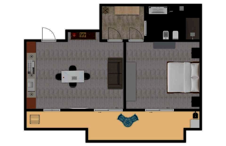 L'ingresso si apre su una luminosa e accogliente zona giorno open space con angolo cottura, pensata per unire convivialità e design. Il vero fiore all'occhiello della casa è l'ampia veranda, uno spazio esterno vivibile perfetto per rilassarsi o per cene all'aperto, che regala profondità e respiro all'intera area living.
