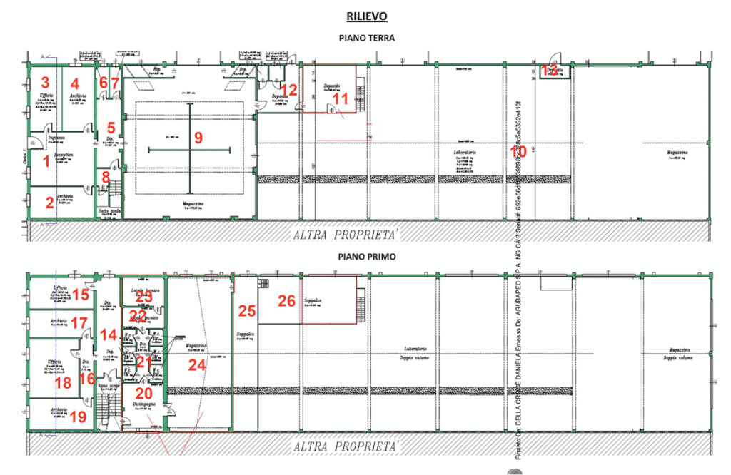 - Piano terra: Include una reception, un ufficio, due archivi, un disimpegno, due bagni, un magazzino con due ripostigli, un laboratorio/magazzino e tre locali ad uso deposito, oltre a due locali ad uso wc.