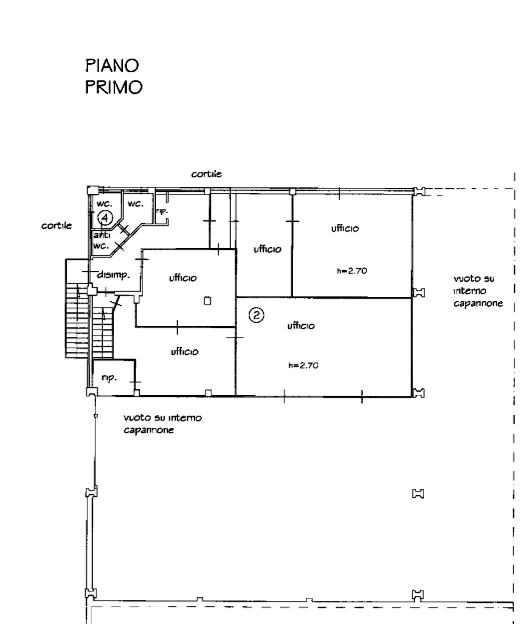 Capannone industriale entro stante a terreno di pertinenza della superficie di 2050 mq, posto su due piani di mq. 1220, al primo piano soppalcato composto da, cinque locali, utilizzati come uffici, divisi da tramezzi mobili, oltre servizio igienico; al piano terreno officina di circa mq. 900, spogliatoio e refettorio, quattro locali utilizzati in parte come magazzini ed in parte come uffici operativi ed un servizio igienico.