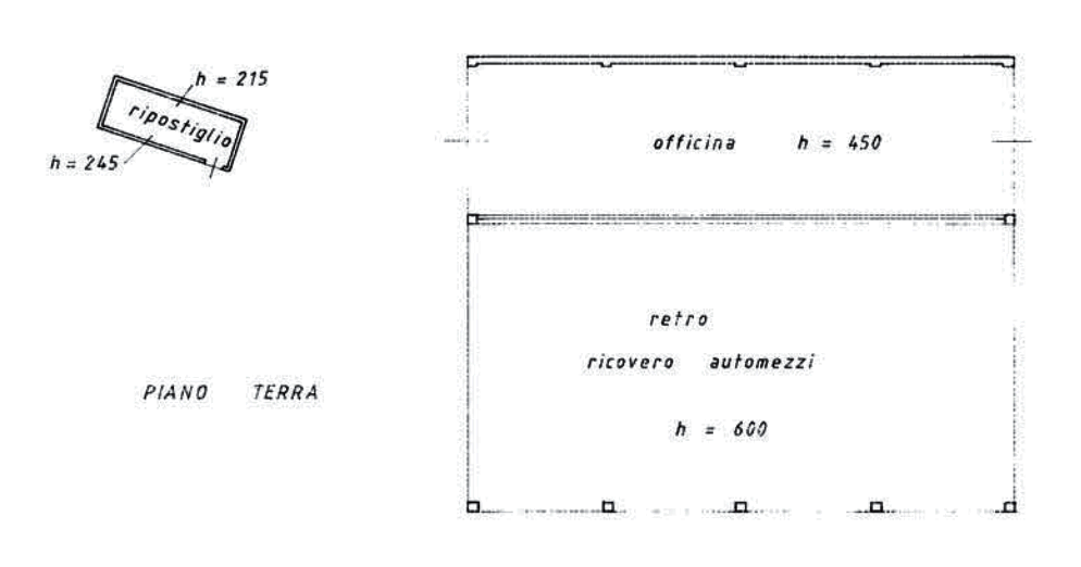 -struttura ad uso ricovero automezzi con officina al piano terra e pertinenziale ripostiglio al piano terra, su corpo secondario;