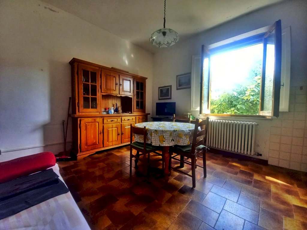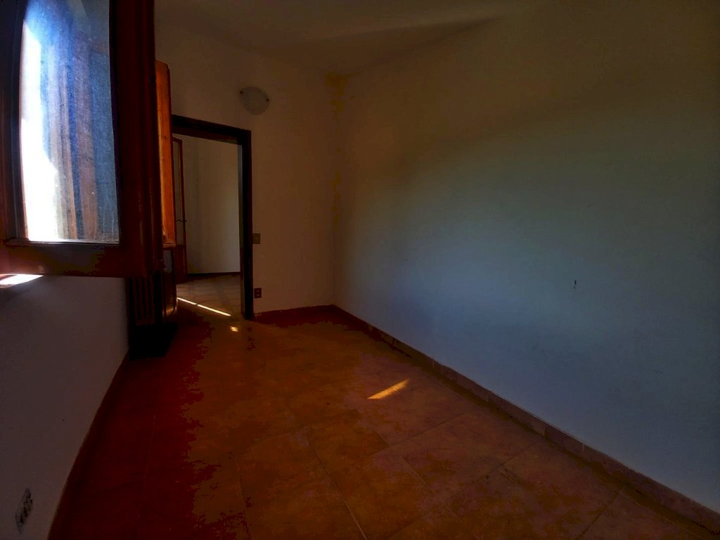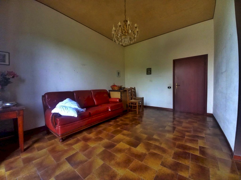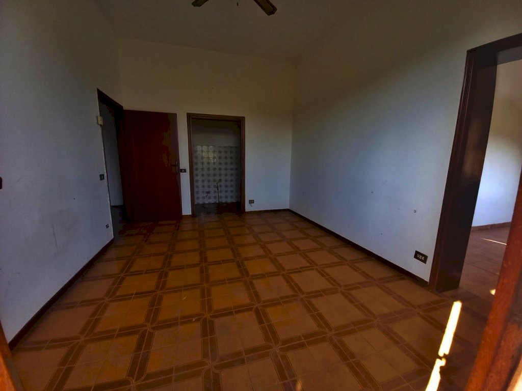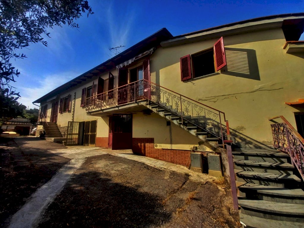 L'immobile si sviluppa su tutto il primo piano dell'edificio ed è composto attualmente da due appartamenti con ingresso indipendente, uno di 4 vani ed uno di 3, con possibilità di riunirli in una unica abitazione di metratura importante. Al piano terra troviamo due magazzini con accesso carrabile e due ripostigli con accesso pedonale, mentre al piano semi-interrato si sviluppano delle ampie cantine tutte comunicanti tra loro con due accessi pedonali da due strade diverse. Affianco all'abitazione principale si trova una comoda aia in mattoni ideale per posteggiare le auto sulla quale affacciano una autorimessa di recente costruzione di circa 56 mq. e dei magazzini completamente da ristrutturare per circa 80 mq., che potrebbero essere anche oggetto di trasformazione in civile abitazione. La proprietà si completa con il terreno circostante che si estende sulla collina davanti all'abitazione per circa 2,5 ettari di terreno seminativo che arrivano fino alla strada statale.