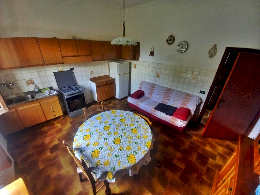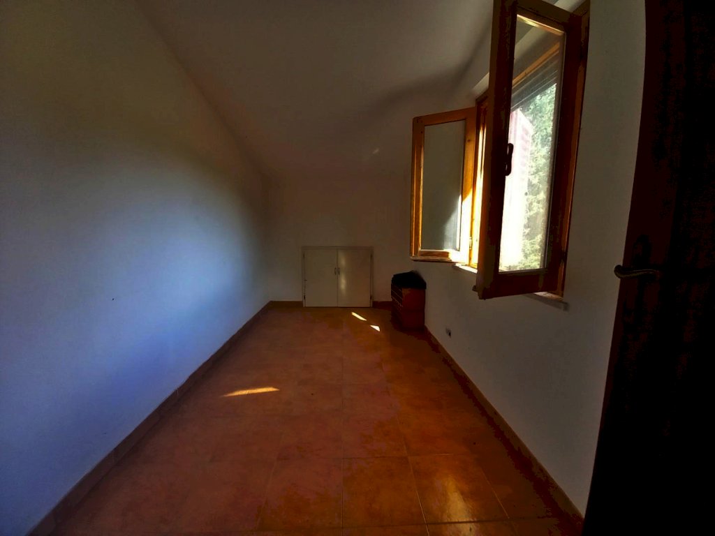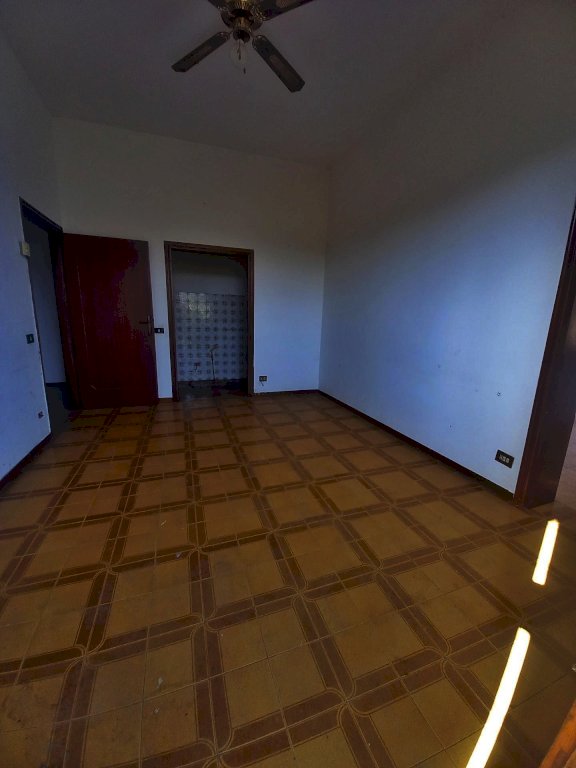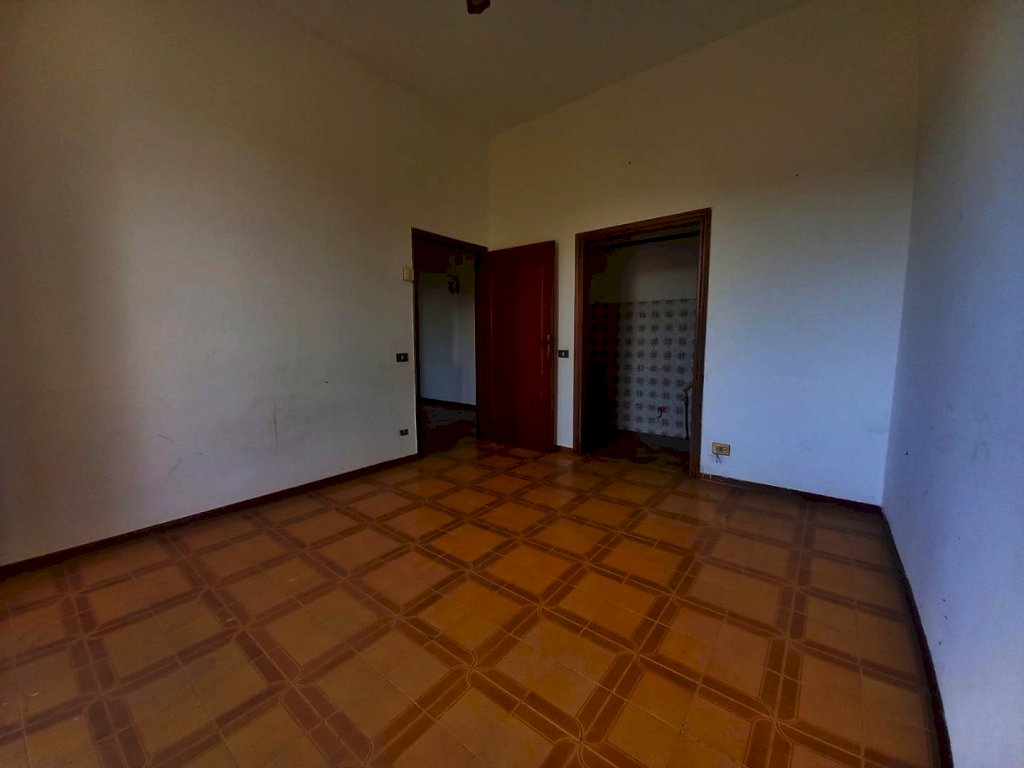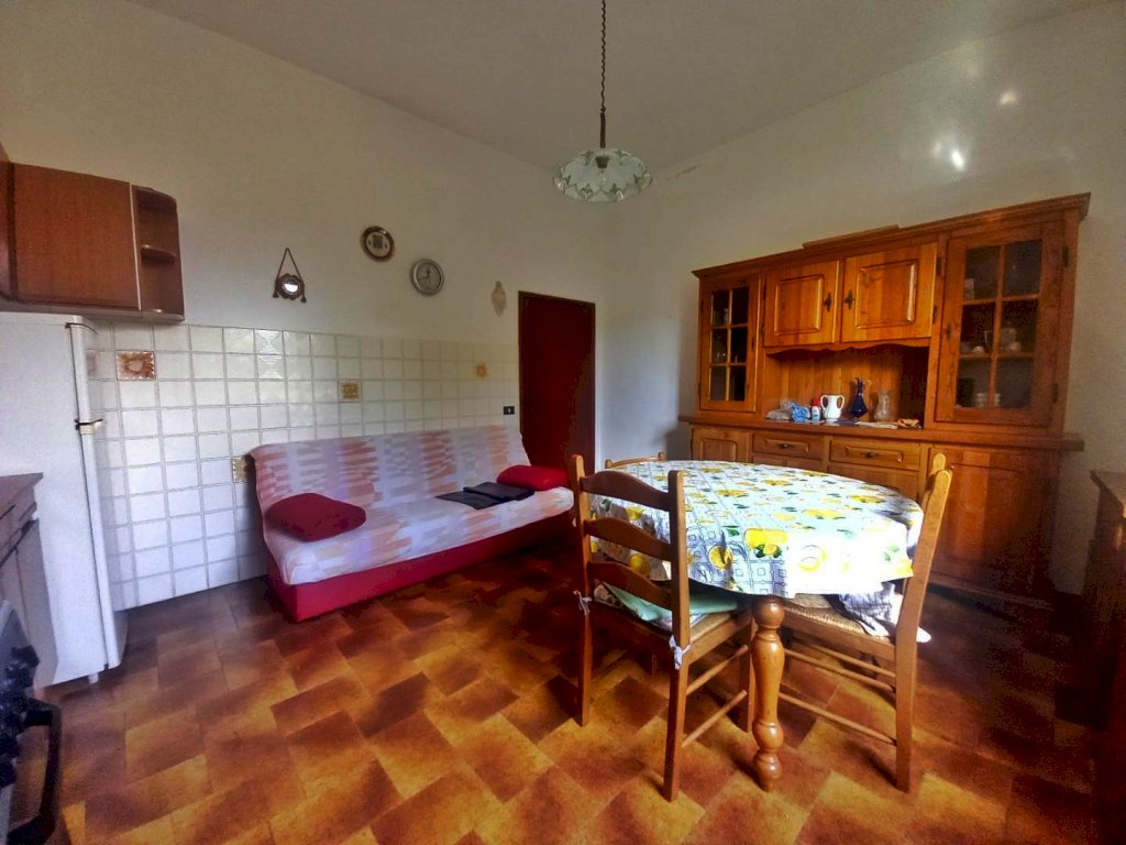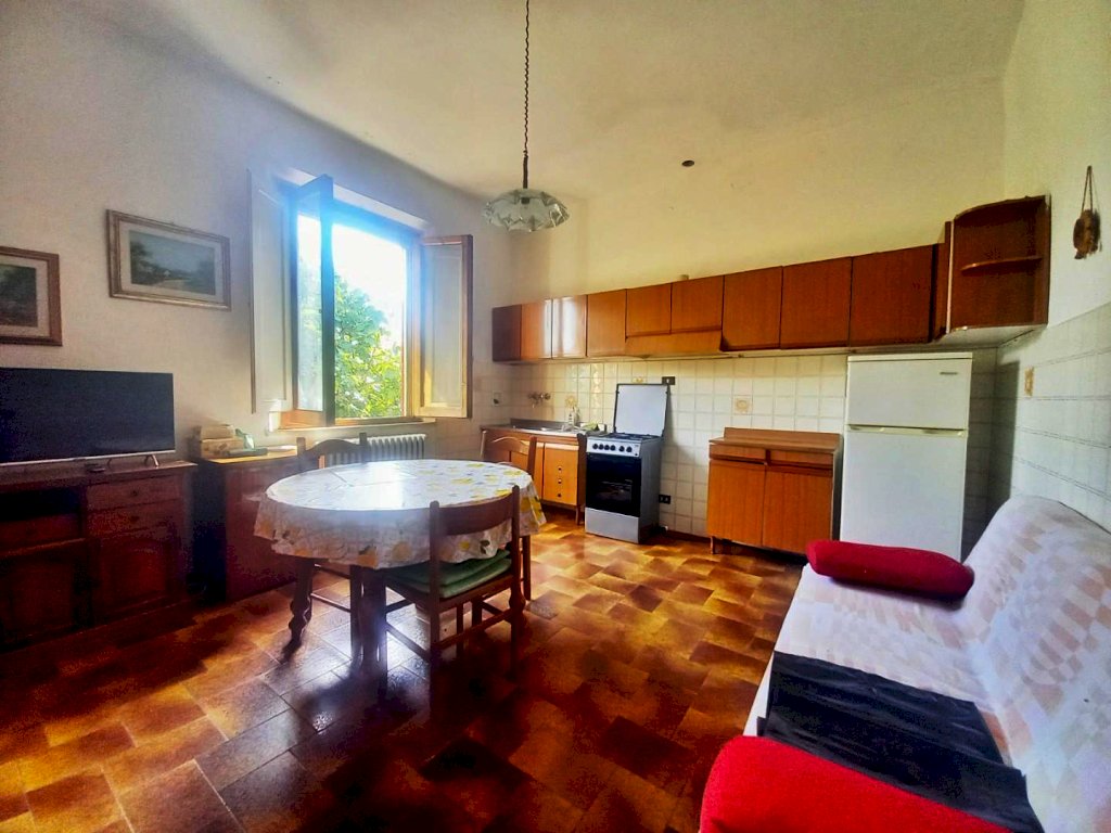 L'immobile si sviluppa su tutto il primo piano dell'edificio ed è composto attualmente da due appartamenti con ingresso indipendente, uno di 4 vani ed uno di 3, con possibilità di riunirli in una unica abitazione di metratura importante. Al piano terra troviamo due magazzini con accesso carrabile e due ripostigli con accesso pedonale, mentre al piano semi-interrato si sviluppano delle ampie cantine tutte comunicanti tra loro con due accessi pedonali da due strade diverse. Affianco all'abitazione principale si trova una comoda aia in mattoni ideale per posteggiare le auto sulla quale affacciano una autorimessa di recente costruzione di circa 56 mq. e dei magazzini completamente da ristrutturare per circa 80 mq., che potrebbero essere anche oggetto di trasformazione in civile abitazione. La proprietà si completa con il terreno circostante che si estende sulla collina davanti all'abitazione per circa 2,5 ettari di terreno seminativo che arrivano fino alla strada statale.