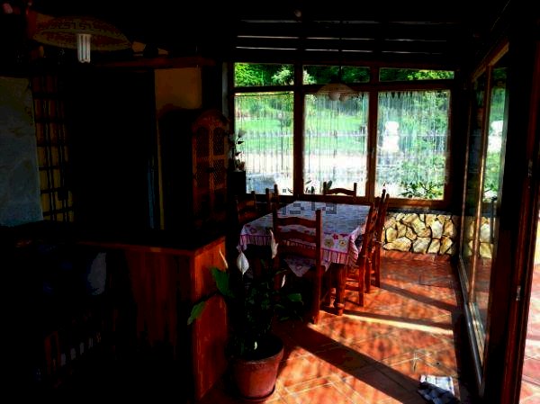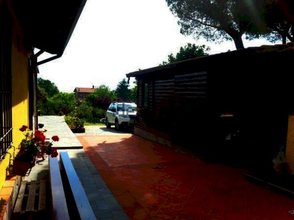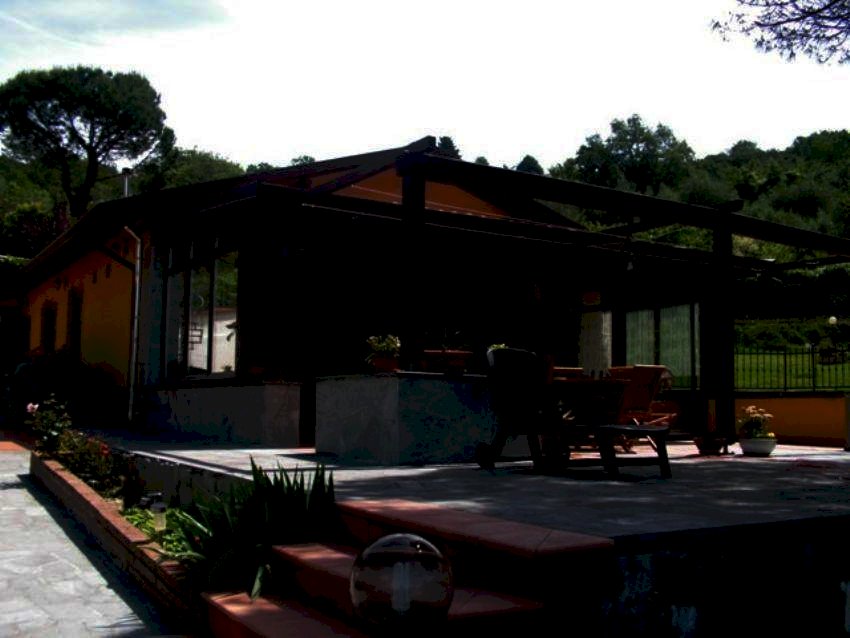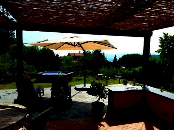 Casa semindipendente ma praticamente indipendente DISPOSTA SU UN UNICO LIVELLO e composta da ampio ingresso, cucina, sala che affaccia sulla bellissima veranda, tre camere da letto e due bagni. Pavimenti in cotto, dotata di riscaldamento a pallet e GPL e condizionatori. Ampio giardino di circa 800 mq con piscina e una zona barbecue con forno per pizza oltre ad un grande ricovero attrezzi e possibilita' di parcheggio interno. Bellissima la posizione panoramica. Da vedere!