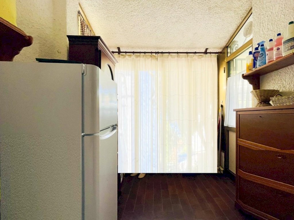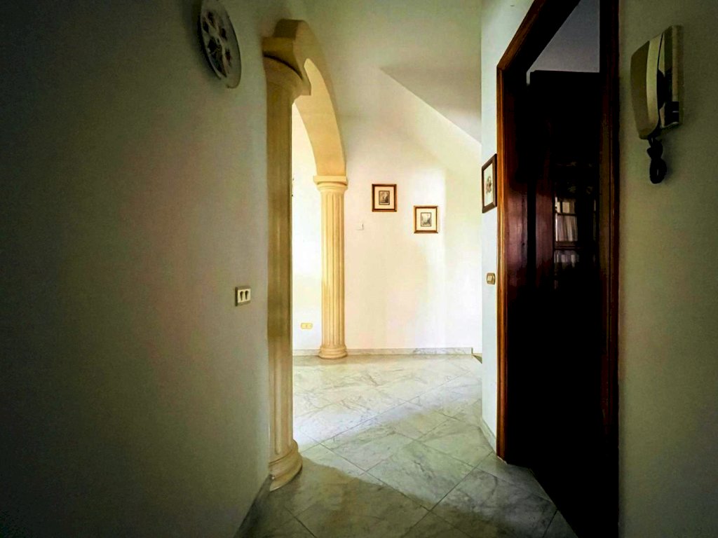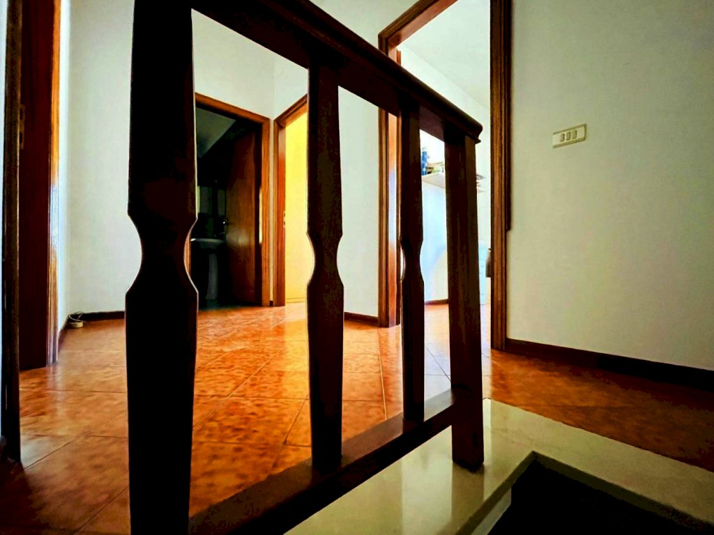 L'ingresso principale avviene nel disimpegno. Questo livello ospita il soggiorno, una cucina abitabile con veranda ed un bagno con box doccia. A piano superiore trova posto la zona notte. Le camere da letto sono tre, una matrimoniale e due medie (una delle quali dispone di balcone). Un secondo spazioso bagno è a disposizione delle persone che vivono la zona notte. Attraverso una scala retrattile si sale al piano sottotetto al momento utilizzato come ripostiglio.