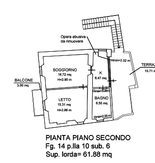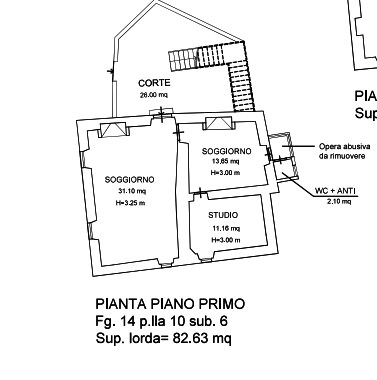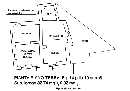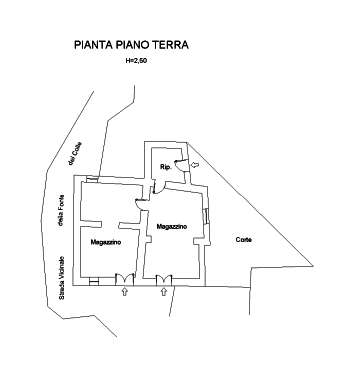 Abitazione sviluppato su tre livelli (piano terra, primo e secondo) con due piccole corti di terreno ad uso esclusivo. Il piano terra si compone di due locali ad uso magazzino con ingressi autonomi. Vi è inoltre un piccolo vano ripostiglio autonomo. La corte esclusiva ha una superficie di circa mq. 40,00. Il piano primo e il secondo sono adibiti ad abitazione