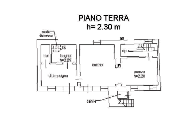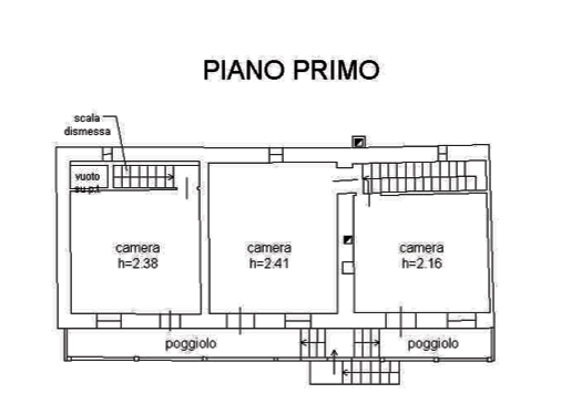 si compone al piano terra da una cucina, zona pranzo con adiacente vano scale per l'accesso ai piani superiori, disimpegno accessibile dalla cucina, bagno e ripostiglio; al piano primo tre camere da letto, scala interpiano e scala dismessa; sul fronte principale poggiolo; il piano sottotetto, accessibile tramite una scala a pioli esterna, consta di due soffitte al grezzo.