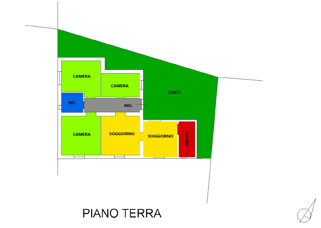 La casa si sviluppa su un unico livello, il che la rende estremamente comoda e adatta a famiglie di tutte le dimensioni. Comprende un cucinotto, un tinello, un soggiorno, tre camere da letto e un bagno.