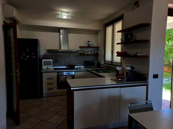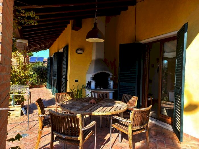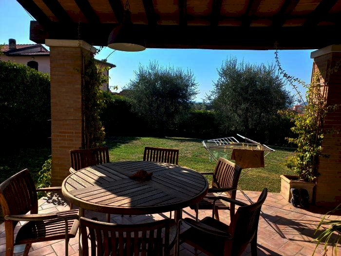 LUNI, in primissima collina, casa indipendente ben rifinita in buona posizione con vista aperta sino al mare. L'immobile in ottimo stato è disposto su vari livelli ed è così composto da ingresso, ampio salone con camino e doppie porte finestre su portico con travi di legno a vista, attrezzato ed aperto sul giardino, disimpegno con cucina e sala da pranzo anch'essa con camino e con porta finestre sullo stesso portico del soggiorno e su ulteriore veranda laterale a piano giardino, bagno di servizio e ripostiglio. Qualche gradino, ci porta al piano superiore dove troviamo, due camere ciascuna con la propria cabina armadio, un bagno con doccia e vasca idromassaggio e camera padronale con al suo interno cabina armadio e bagno, saliamo ancora qualche gradino e troviamo grande soppalco attrezzato in parte come studio con porta finestra su balcone con vista sino al mare, in parte a salotto, oltre un ulteriore locale armadio e ripostigli nel sottotetto. Al piano seminterrato troviamo una grande taverna con uscita anche diretta verso l'esterno e locale tecnico/lavanderia, scendiamo ancora qualche gradino e troviamo un ampio garage dove possono essere ospitate sino a 3/4 auto. L'immobile è fornito di condizionatori ed è disponibile in breve tempo.