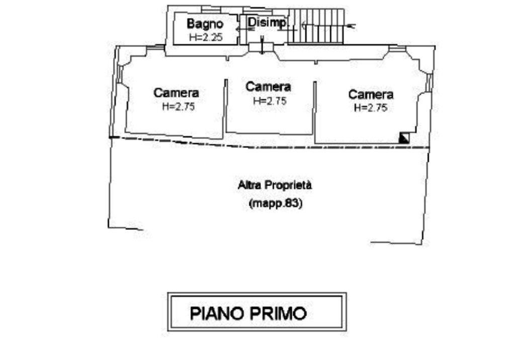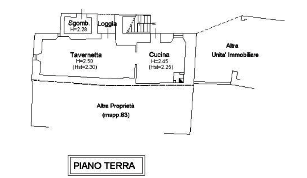 - Abitazione di mq. 105,1 composto da piano terra con tavernetta, locale sgombero, loggia e cucina, al piano primo con tre camere, un bagno e disimpegno.