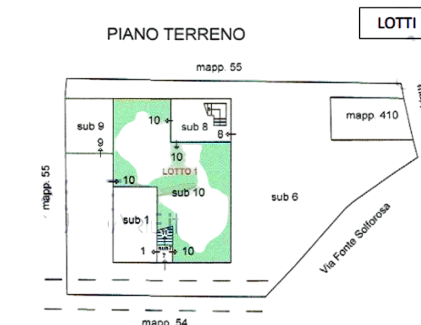 L'immobile è suddiviso in tre alloggi, il piano terra è composto da soggiorno luminoso con due finestre affacciate sia sul cortile interno che sulla strada privata, tinello con funzione di ingresso, cucina separata con angolo destinato ai servizi, una camera, ripostiglio nel sottoscala e cantina per una superficie totale di circa 85mq.