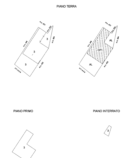 al piano primo: tre camere, il guardaroba, il bagno, il disimpegno, il magazzino, due vani scale di collegamento al piano terra e la terrazza.
