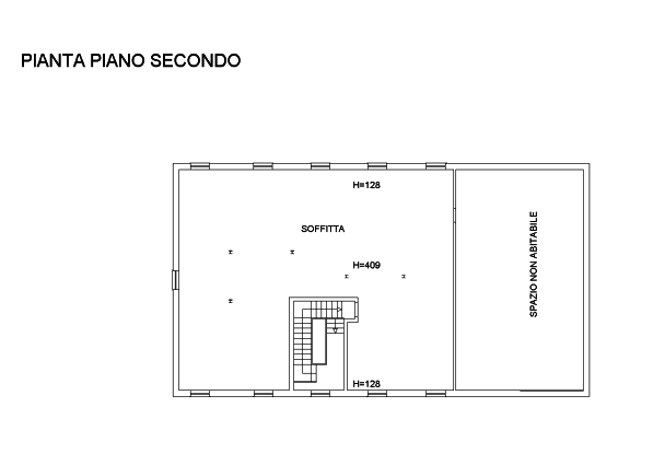 Dalla scala si accede al piano secondo dove si sviluppa un grande locale soffitta abitabile, e ad un secondo spazio soffitta.