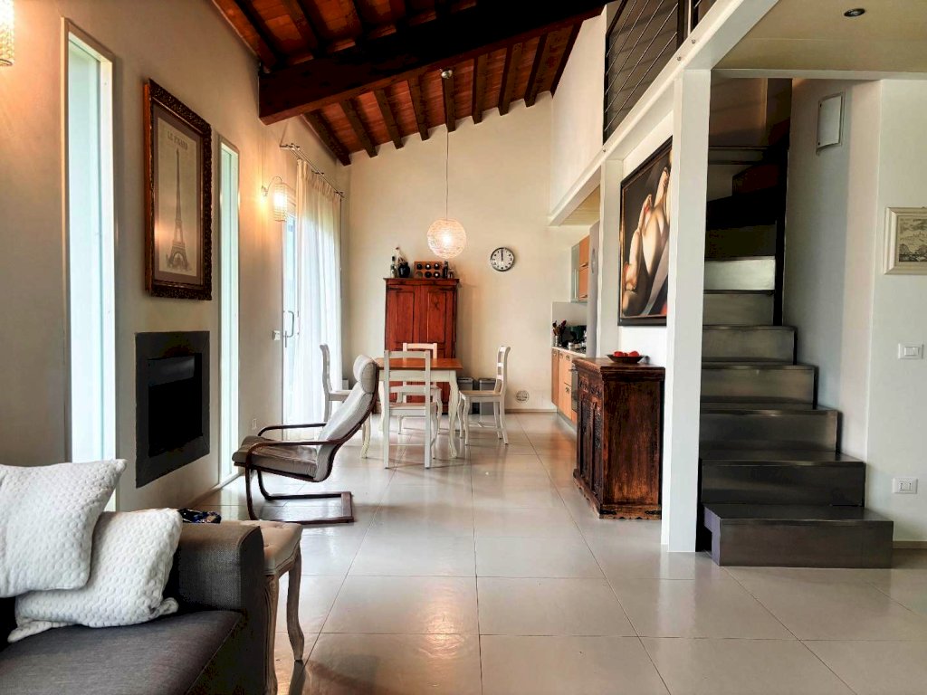 Soppalco: Una scala d'arredo in metallo di design conduce dal salotto al piano superiore, dove un ampio e suggestivo soppalco si presta perfettamente come studio, zona relax o secondo salotto.
