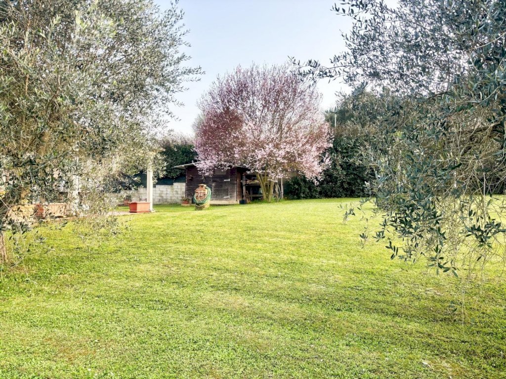 La casa è circondata da un generoso giardino di circa 1800 mq, arricchito da ulivi che donano un tocco autentico al paesaggio toscano. La proprietà è interamente recintata e delimitata da siepi per la massima privacy. L'accesso avviene tramite un cancello automatico privato che conduce a un'area parcheggio dedicata.