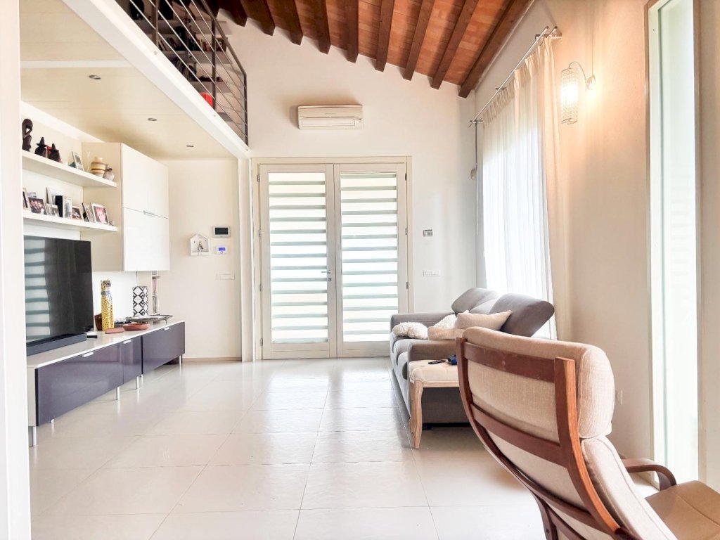 Soppalco: Una scala d'arredo in metallo di design conduce dal salotto al piano superiore, dove un ampio e suggestivo soppalco si presta perfettamente come studio, zona relax o secondo salotto.