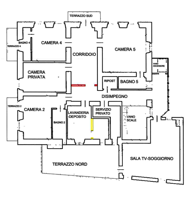 composta da due camere con bagno , una camera e il disimpegno chiuso da una tramezza che da sul disimpegno a cui si affaccia una camera con bagno, un vano lavanderia-deposito e un servizio per il piano e un piccolo ripostiglio e dal disimpegno in cui arriva l'ascensore si accede alla sala tv-soggiorno