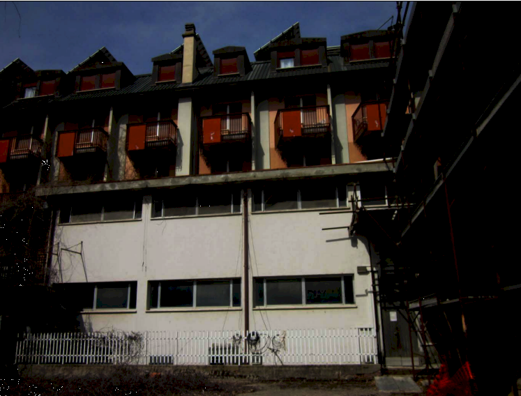 La porzione B costituisce la parte originaria dell'albergo, articolata su più livelli e attualmente in disuso, con ambienti interni e camere oggetto di interventi di ristrutturazione non ultimati.