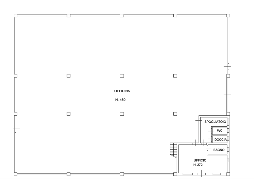 L'immobile è composto al piano terra da ampio locale officina, attigui uffici e servizi con spogliatoio e sovrastante ripostiglio raggiungibile da scala in legno per una superficie di circa 1056,50 mq.