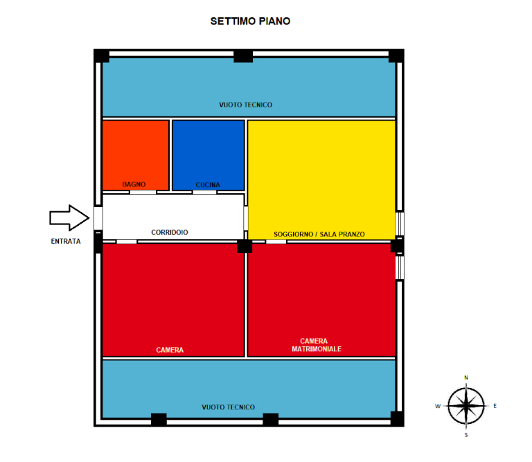 L'unità immobiliare, disponibile dalla stipula, è disposta su un solo livello, al piano settimo raggiungibile con ascensore. Essa è composta da: ingresso/corridoio, un soggiorno pranzo, due camere da letto, un bagno con vasca e un cucinino. L'immobile dispone anche di vani tecnici ispezionabili e con possibilità di adibire a deposito.