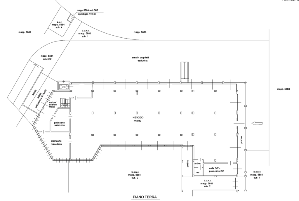 Al piano terra si trova l'intera area di vendita, nella parte posteriore dell'area a negozio, vengono rilevate le stanze di preparazione dei salumi, della